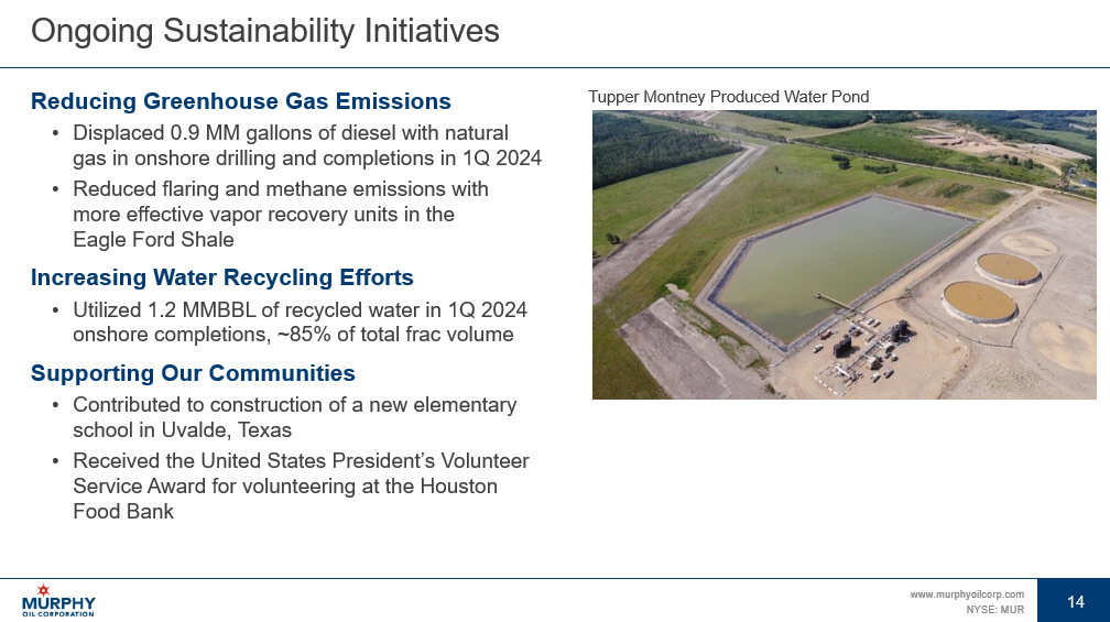13 www.murphyoilcorp.com NYSE: MUR 13 Capital Allocation Priorities Reducing Long - Term Debt, Increasing Shareholder Returns Beyond Quarterly Dividend With Framework 1 1 The timing and magnitude of debt reductions and share repurchases will largely depend on oil and natural gas prices, developm ent costs and operating expenses, as well as any high - return investment opportunities. Because of the uncertainties around these matters, it is not poss ible to forecast how and when the company’s targets might be achieved 2 The share repurchase program allows the company to repurchase shares through a variety of methods, including but not limited to open market purchases, privately negotiated transactions and other means in accordance with federal securities laws, such as through Rule 10b5 - 1 tradin g plans and under Rule 10b - 18 of the Exchange Act. This repurchase program has no time limit and may be suspended or discontinued completely at any tim e without prior notice as determined by the company at its discretion and dependent upon a variety of factors 3 Other projected payments such as withholding tax on incentive compensation Board Authorized Share Repurchase Program 2 Remaining Balance as of June 11, 2024 $350 MM Allocate adjusted FCF to long - term debt reduction Continue supporting the quarterly dividend Murphy 1.0 – Long - Term Debt > $1.8 BN ~75% of adjusted FCF allocated to debt reduction ~25% distributed through share buybacks and potential dividend increases Up to 50% of adjusted FCF allocated to the balance sheet Minimum of 50% of adjusted FCF allocated to share buybacks and potential dividend increases Murphy 2.0 – Long - Term Debt of $1.0 BN – $1.8 BN Murphy 3.0 – Long - Term Debt ≤ $1.0 BN Cash Flow From Operations Before WC Change ( - ) Capital expenditures = Free Cash Flow ( - ) Distributions to NCI and projected payments 3 ( - ) Quarterly dividend ( - ) Accretive acquisitions = Adjusted Free Cash Flow (Adjusted FCF) Adjusted Free Cash Flow Formula