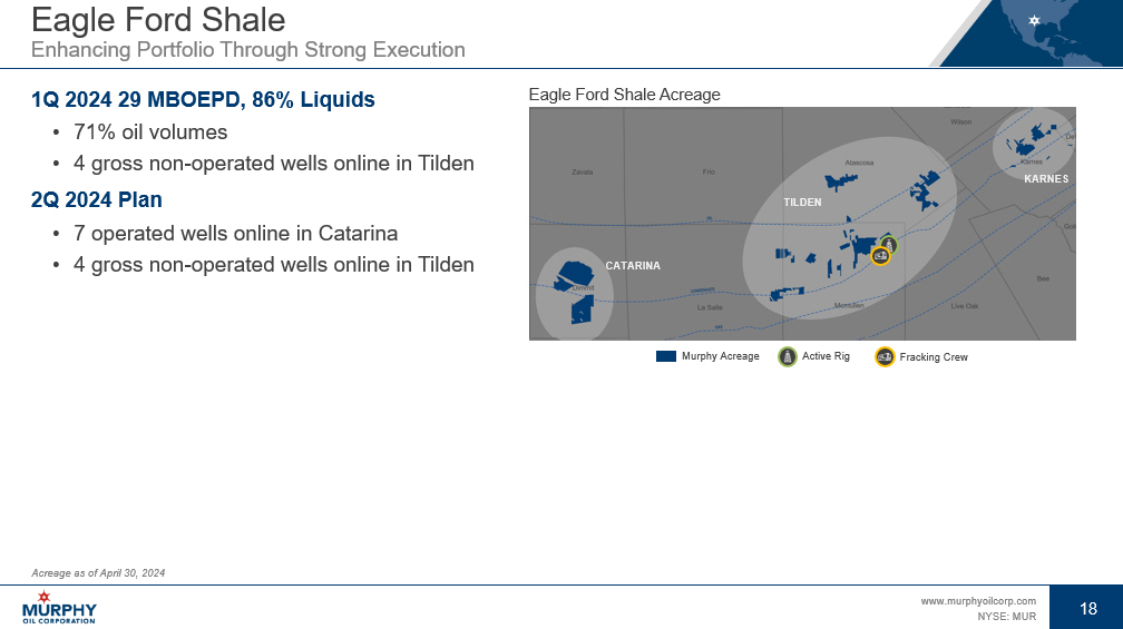 17 www.murphyoilcorp.com NYSE: MUR 17 2024 North America Onshore Plan Balancing Investments for Free Cash Flow Generation Note: Non - op well cadence subject to change per operator plans Eagle Ford Shale non - operated wells adjusted for 27% average working interest FY 2024E Wells Online 0 5 10 15 20 25 1Q 2024A 2Q 2024E 3Q 2024E 4Q 2024E Eagle Ford Shale Kaybob Duvernay Tupper Montney Eagle Ford Shale (Non-Op) 98 MBOEPD Forecast for FY 2024 • 25% oil volumes, 30% liquids volumes Eagle Ford Shale • 20 operated wells online • 15 Catarina wells • 5 Tilden wells • 20 gross non - operated Tilden wells online • 11 operated Karnes wells drilled for 2025 completion Tupper Montney • 13 operated wells online • Assumes C$2.11 / MMBTU AECO Kaybob Duvernay • 3 operated wells online • Drilling 4 - well operated pad in 4Q 2024 for 2025 completion