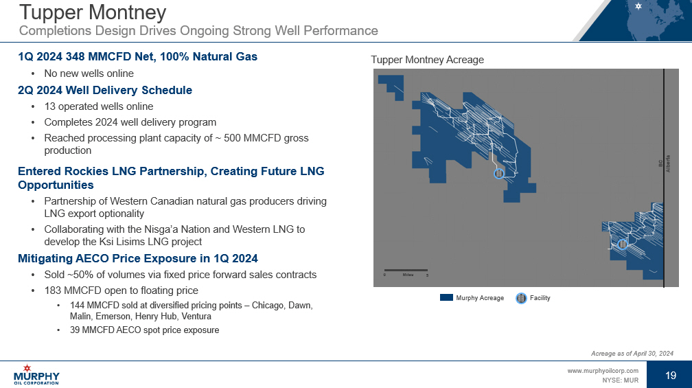 18 www.murphyoilcorp.com NYSE: MUR 18 Eagle Ford Shale Enhancing Portfolio Through Strong Execution 1Q 2024 29 MBOEPD, 86% Liquids • 71% oil volumes • 4 gross non - operated wells online in Tilden 2Q 2024 Plan • 7 operated wells online in Catarina • 4 gross non - operated wells online in Tilden Acreage as of April 30, 2024 Eagle Ford Shale Acreage CATARINA TILDEN KARNES Murphy Acreage Active Rig Fracking Crew