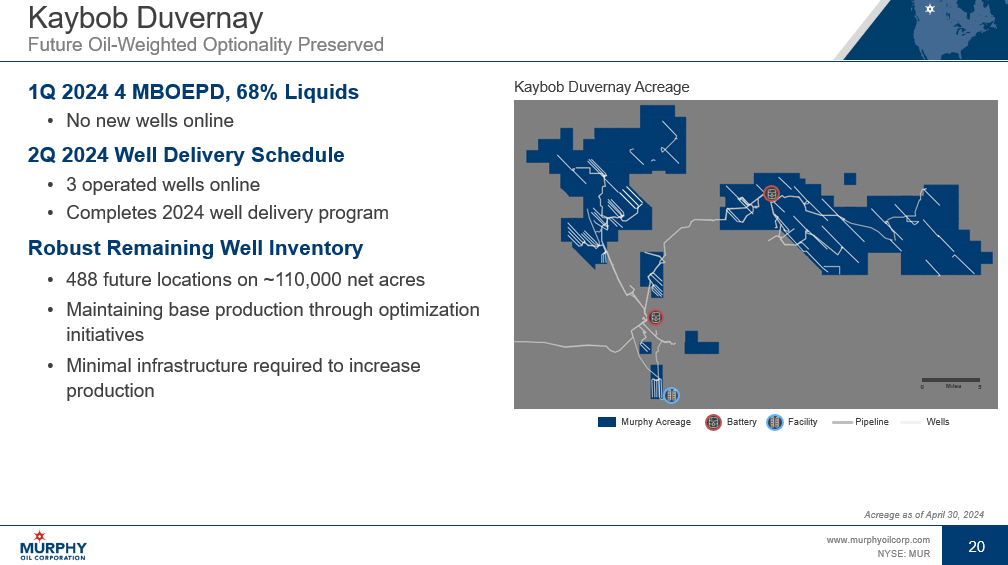 19 www.murphyoilcorp.com NYSE: MUR 19 Tupper Montney Completions Design Drives Ongoing Strong Well Performance 1Q 2024 348 MMCFD Net, 100% Natural Gas • No new wells online 2Q 2024 Well Delivery Schedule • 13 operated wells online • Completes 2024 well delivery program • Reached processing plant capacity of ~ 500 MMCFD gross production Entered Rockies LNG Partnership, Creating Future LNG Opportunities • Partnership of Western Canadian natural gas producers driving LNG export optionality • Collaborating with the Nisga’a Nation and Western LNG to develop the Ksi Lisims LNG project Mitigating AECO Price Exposure in 1Q 2024 • Sold ~50% of volumes via fixed price forward sales contracts • 183 MMCFD open to floating price • 144 MMCFD sold at diversified pricing points – Chicago, Dawn, Malin, Emerson, Henry Hub, Ventura • 39 MMCFD AECO spot price exposure Tupper Montney Acreage Facility Murphy Acreage 5 0 Miles BC Alberta Acreage as of April 30 , 2024