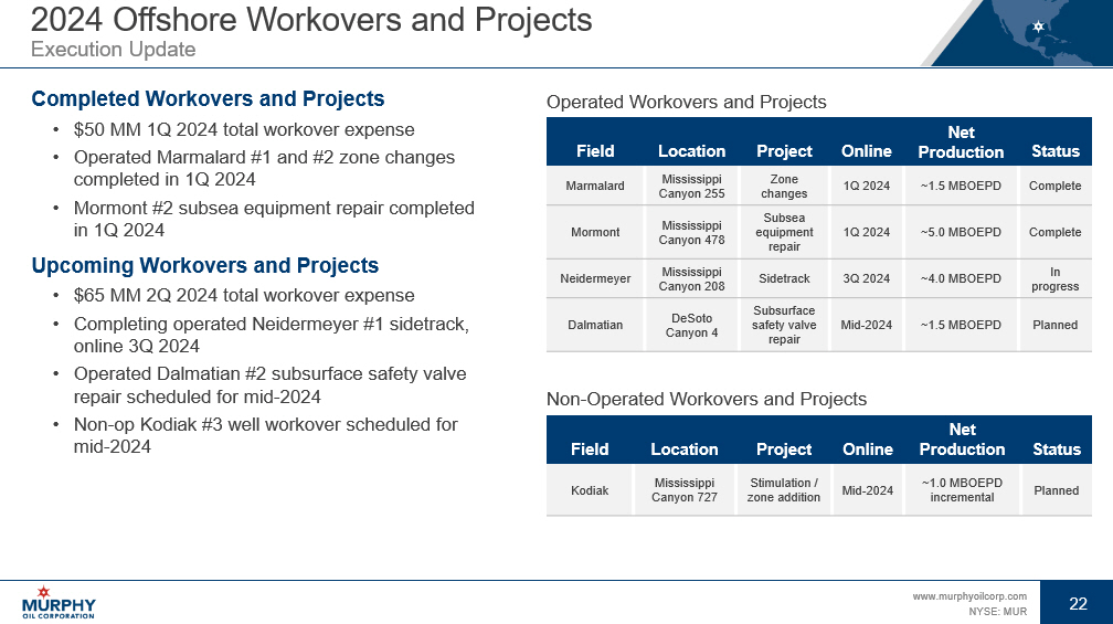 21 www.murphyoilcorp.com NYSE: MUR 21 Offshore Update Focusing on Executing Highly - Accretive Development Projects Total Offshore 1Q 2024 79 MBOEPD, 84% Oil Gulf of Mexico 1Q 2024 73 MBOEPD, 82% Oil • Completed Khaleesi #4 , online 2Q 2024 as planned • Drilling Mormont #3 in 2Q 2024, online 3Q 2024 • Non - operated St. Malo PS008 online 1Q 2024 • Non - operated Lucius #11 online 2Q 2024 Offshore Canada 1Q 2024 6 MBOEPD, 100% Oil • Terra Nova producing following completion of FPSO life extension in 4Q 2023 Highly - Accretive Development and Tieback Projects Online Completions Drilling Field 2Q 2024 Khaleesi 2H 2024 Mormont 2025 Samurai 2025 Dalmatian 2026 Longclaw 1H 2024 - 2025 Lucius (non - op) In progress Planned activity Completed activity Offshore Canada Development Projects Online Activity Field 2024 5 development wells Hibernia (non - op)