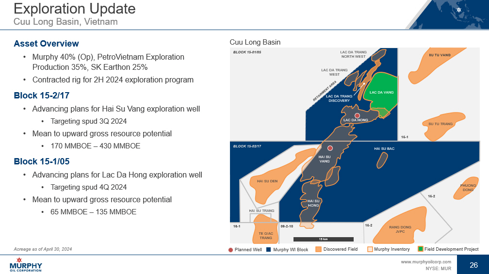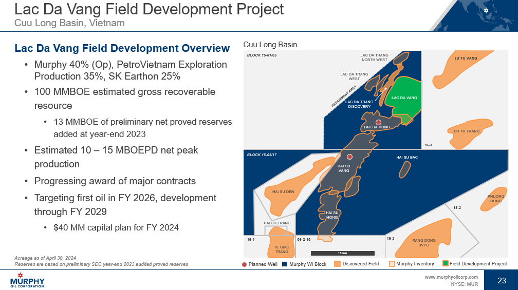23 www.murphyoilcorp.com NYSE: MUR 23 Lac Da Vang Field Development Project Cuu Long Basin, Vietnam Lac Da Vang Field Development Overview • Murphy 40% (Op), PetroVietnam Exploration Production 35%, SK Earthon 25% • 100 MMBOE estimated gross recoverable resource • 13 MMBOE of preliminary net proved reserves added at year - end 2023 • Estimated 10 – 15 MBOEPD net peak production • Progressing award of major contracts • Targeting first oil in FY 2026, development through FY 2029 • $40 MM capital plan for FY 2024 Acreage as of April 30, 2024 Reserves are based on preliminary SEC year - end 2023 audited proved reserves Cuu Long Basin Murphy WI Block Murphy Inventory Discovered Field Field Development Project Planned Well BLOCK 15 - 02/17 15 - 2 15 - 2 16 - 1 15 - 1 09 - 2 - 10 BLOCK 15 - 01/05 SU TU VANG LAC DA VANG TE GIAC TRANG RANG DONG JVPC PHUONG DONG HAI SU DEN HAI SU TRANG LAC DA HONG HAI SU HONG HAI SU BAC HAI SU VANG LAC DA TRANG DISCOVERY SU TU TRANG LAC DA TRANG WEST LAC DA TRANG NORTH WEST 15 km