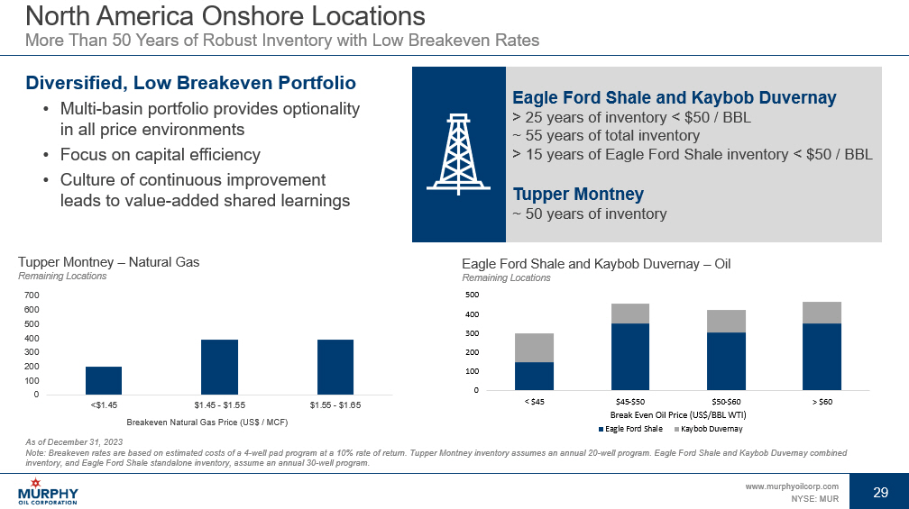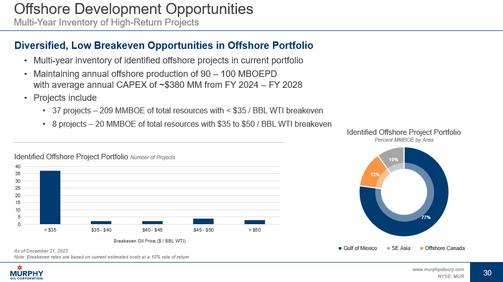 29 www.murphyoilcorp.com NYSE: MUR 29 North America Onshore Locations More Than 50 Years of Robust Inventory with Low Breakeven Rates Diversified, Low Breakeven Portfolio • Multi - basin portfolio provides optionality in all price environments • Focus on capital efficiency • Culture of continuous improvement leads to value - added shared learnings As of December 31, 2023 Note: Breakeven rates are based on estimated costs of a 4 - well pad program at a 10% rate of return. Tupper Montney inventory ass umes an annual 20 - well program. Eagle Ford Shale and Kaybob Duvernay combined inventory, and Eagle Ford Shale standalone inventory, assume an annual 30 - well program. Eagle Ford Shale and Kaybob Duvernay > 25 years of inventory < $50 / BBL ~ 55 years of total inventory > 15 years of Eagle Ford Shale inventory < $50 / BBL Tupper Montney ~ 50 years of inventory Eagle Ford Shale and Kaybob Duvernay – Oil Remaining Locations Tupper Montney – Natural Gas Remaining Locations 0 100 200 300 400 500 600 700 <$1.45 $1.45 - $1.55 $1.55 - $1.65 Breakeven Natural Gas Price (US$ / MCF) 0 100 200 300 400 500 < $45 $45-$50 $50-$60 > $60 Break Even Oil Price (US$/BBL WTI) Eagle Ford Shale Kaybob Duvernay