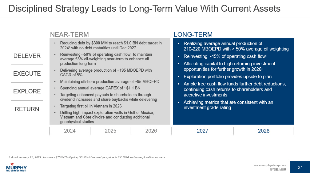 30 www.murphyoilcorp.com NYSE: MUR 30 Offshore Development Opportunities Multi - Year Inventory of High - Return Projects Diversified, Low Breakeven Opportunities in Offshore Portfolio • Multi - year inventory of identified offshore projects in current portfolio • Maintaining annual offshore production of 90 – 100 MBOEPD with average annual CAPEX of ~$380 MM from FY 2024 – FY 2028 • Projects include • 37 projects – 209 MMBOE of total resources with < $35 / BBL WTI breakeven • 8 projects – 20 MMBOE of total resources with $35 to $50 / BBL WTI breakeven 0 5 10 15 20 25 30 35 40 < $35 $35 - $40 $40 - $45 $45 - $50 > $50 Breakeven Oil Price ($ / BBL WTI) Identified Offshore Project Portfolio Percent MMBOE by Area Identified Offshore Project Portfolio Number of Projects As of December 31, 2023 Note: Breakeven rates are based on current estimated costs at a 10% rate of return Gulf of Mexico SE Asia Offshore Canada 77% 13% 10%