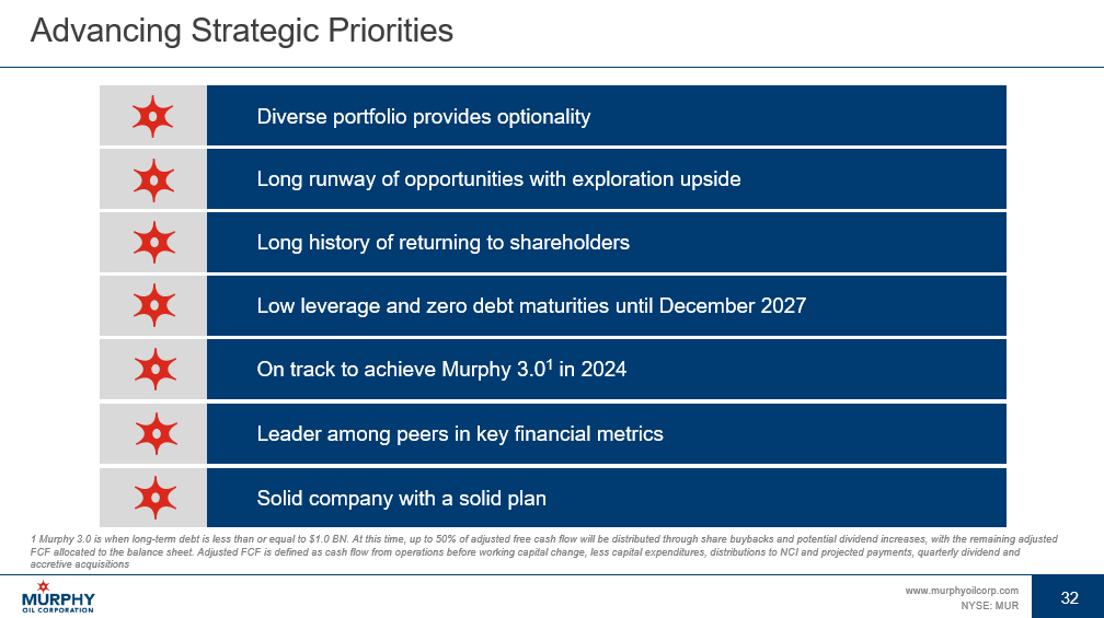 31 www.murphyoilcorp.com NYSE: MUR 31 Disciplined Strategy Leads to Long - Term Value With Current Assets 1 As of January 25, 2024. Assumes $75 WTI oil price, $3.50 HH natural gas price in FY 2024 and no exploration success 2028 2027 2026 2025 2024 • Realizing average annual production of 210 - 220 MBOEPD with > 50% average oil weighting • Reinvesting ~45% of operating cash flow 1 • Allocating capital to high - returning investment opportunities for further growth in 2028+ • Exploration portfolio provides upside to plan • Ample free cash flow funds further debt reductions, continuing cash returns to shareholders and accretive investments • Achieving metrics that are consistent with an investment grade rating • Reducing debt by $300 MM to reach $1 .0 BN debt target in 2024 1 with no debt maturities until Dec 2027 • Reinvesting ~50% of operating cash flow 1 to maintain average 53% oil - weighting near - term to enhance oil production long - term • Delivering average production of ~195 MBOEPD with CAGR of 5% • Maintaining offshore production average of ~95 MBOEPD • Spending annual average CAPEX of ~$1.1 BN • Targeting enhanced payouts to shareholders through dividend increases and share buybacks while delevering • Targeting first oil in Vietnam in 2026 • Drilling high - impact exploration wells in Gulf of Mexico, Vietnam and Côte d'Ivoire and conducting additional geophysical studies LONG - TERM NEAR - TERM DELEVER EXECUTE EXPLORE RETURN
