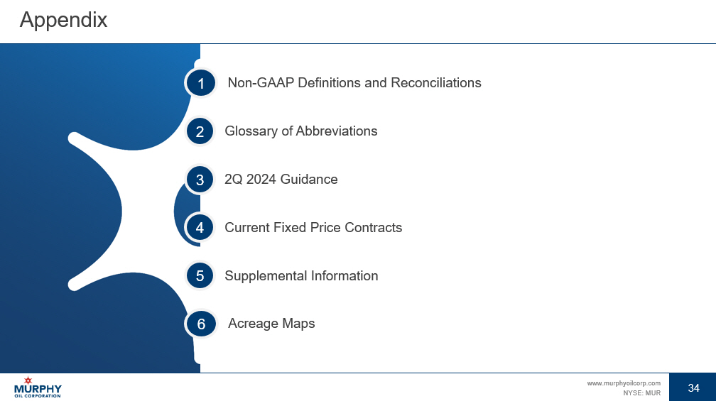 34 www.murphyoilcorp.com NYSE: MUR 34 Appendix 1 Non - GAAP Definitions and Reconciliations 2 Glossary of Abbreviations 3 2Q 2024 Guidance 5 Supplemental Information 4 Current Fixed Price Contracts 6 Acreage Maps