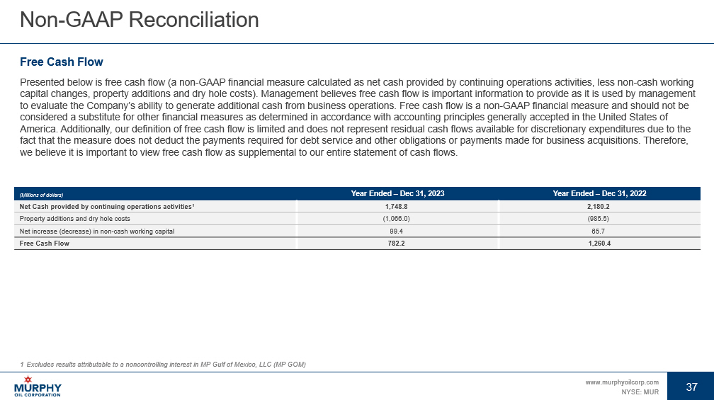 37 www.murphyoilcorp.com NYSE: MUR 37 Non - GAAP Reconciliation Free Cash Flow Presented below is free cash flow (a non - GAAP financial measure calculated as net cash provided by continuing operations activit ies, less non - cash working capital changes, property additions and dry hole costs). Management believes free cash flow is important information to provi de as it is used by management to evaluate the Company’s ability to generate additional cash from business operations. Free cash flow is a non - GAAP financial m easure and should not be considered a substitute for other financial measures as determined in accordance with accounting principles generally accepte d i n the United States of America. Additionally, our definition of free cash flow is limited and does not represent residual cash flows available for d isc retionary expenditures due to the fact that the measure does not deduct the payments required for debt service and other obligations or payments made for busin ess acquisitions. Therefore, we believe it is important to view free cash flow as supplemental to our entire statement of cash flows. Year Ended – Dec 31, 2022 Year Ended – Dec 31, 2023 (Millions of dollars) 2,180.2 1,748.8 Net Cash provided by continuing operations activities 1 (985.5) (1,066.0) Property additions and dry hole costs 65.7 99.4 Net increase (decrease) in non - cash working capital 1,260.4 782.2 Free Cash Flow 1 Excludes results attributable to a noncontrolling interest in MP Gulf of Mexico, LLC (MP GOM)