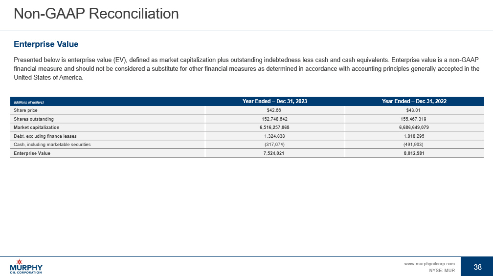 38 www.murphyoilcorp.com NYSE: MUR 38 Non - GAAP Reconciliation Enterprise Value Presented below is enterprise value (EV), defined as market capitalization plus outstanding indebtedness less cash and cash e qui valents. Enterprise value is a non - GAAP financial measure and should not be considered a substitute for other financial measures as determined in accordance with acc oun ting principles generally accepted in the United States of America. Year Ended – Dec 31, 2022 Year Ended – Dec 31, 2023 (Millions of dollars) $43.01 $42.66 Share price 155,467,319 152,748,642 Shares outstanding 6,686,649,079 6,516,257,068 Market capitalization 1,818,295 1,324,838 Debt, excluding finance leases (491,963) (317,074) Cash, including marketable securities 8,012,981 7,524,021 Enterprise Value