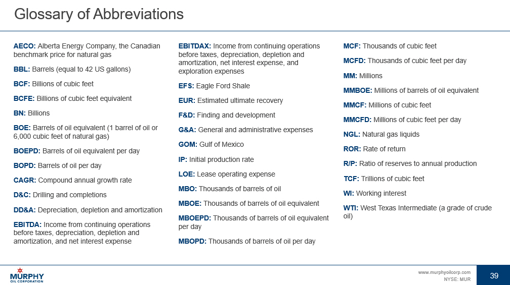 39 www.murphyoilcorp.com NYSE: MUR 39 AECO: Alberta Energy Company, the Canadian benchmark price for natural gas BBL: Barrels (equal to 42 US gallons) BCF: Billions of cubic feet BCFE: Billions of cubic feet equivalent BN: Billions BOE: Barrels of oil equivalent (1 barrel of oil or 6,000 cubic feet of natural gas) BOEPD: Barrels of oil equivalent per day BOPD: Barrels of oil per day CAGR: Compound annual growth rate D&C: Drilling and completions DD&A: Depreciation, depletion and amortization EBITDA: Income from continuing operations before taxes, depreciation, depletion and amortization, and net interest expense EBITDAX: Income from continuing operations before taxes, depreciation, depletion and amortization, net interest expense, and exploration expenses EFS: Eagle Ford Shale EUR: Estimated ultimate recovery F&D: Finding and development G&A: General and administrative expenses GOM: Gulf of Mexico IP: Initial production rate LOE: Lease operating expense MBO: Thousands of barrels of oil MBOE: Thousands of barrels of oil equivalent MBOEPD: Thousands of barrels of oil equivalent per day MBOPD: Thousands of barrels of oil per day MCF: Thousands of cubic feet MCFD: Thousands of cubic feet per day MM: Millions MMBOE: Millions of barrels of oil equivalent MMCF: Millions of cubic feet MMCFD: Millions of cubic feet per day NGL: Natural gas liquids ROR: Rate of return R/P: Ratio of reserves to annual production TCF: Trillions of cubic feet WI: Working interest WTI: West Texas Intermediate (a grade of crude oil) Glossary of Abbreviations