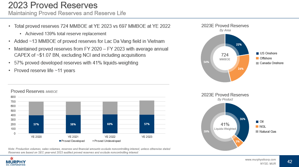 41 www.murphyoilcorp.com NYSE: MUR 41 Current Fixed Price Contracts – Natural Gas Tupper Montney, Canada End Date Start Date Price (MCF) Volumes (MMCFD) Type Commodity 12/31/2024 4/1/2024 C$2.39 162 Fixed Price Forward Sales at AECO Natural Gas 10/31/2024 4/1/2024 US$1.98 25 Fixed Price Forward Sales at AECO Natural Gas 12/31/2024 11/1/2024 US$1.98 15 Fixed Price Forward Sales at AECO Natural Gas As of April 30, 2024 Note: These contracts are for physical delivery of natural gas volumes at a fixed price, with no mark - to - market income adjustmen t