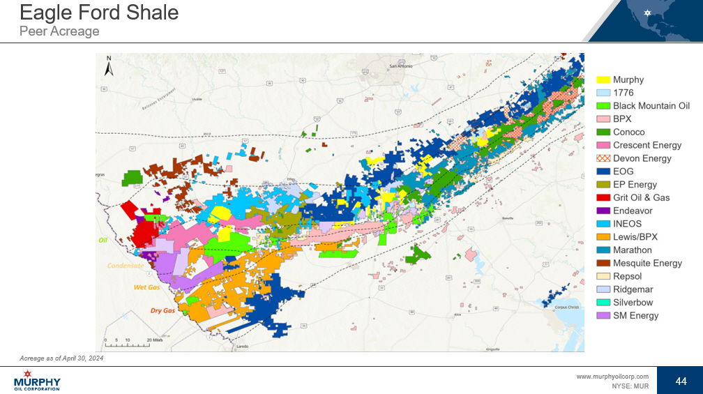 43 www.murphyoilcorp.com NYSE: MUR 43 North America Onshore Well Locations Gross Remaining Locations Inter - Well Spacing (ft) Reservoir Net Acres Area 91 300 Lower EFS 10,155 Karnes 150 850 Upper EFS 104 1,100 Austin Chalk 202 600 Lower EFS 61,611 Tilden 51 1,200 Upper EFS 86 1,200 Austin Chalk 190 560 Lower EFS 47,733 Catarina 189 1,280 Upper EFS 97 1,600 Austin Chalk 1,160 119,549 Total Gross Remaining Locations Inter - Well Spacing (ft) Net Acres Area 120 984 28,064 Two Creeks 152 984 32,825 Kaybob East 103 984 26,192 Kaybob West 113 984 23,604 Kaybob North 488 110,685 Total Kaybob Duvernay Well Locations Eagle Ford Shale Operated Well Locations As of December 31, 2023 Gross Remaining Locations Inter - Well Spacing (ft) Net Acres Area 976 984 - 1,323 118,235 Tupper Montney Tupper Montney Well Locations