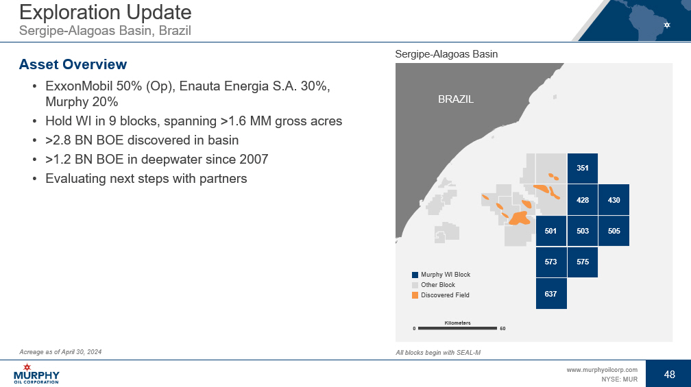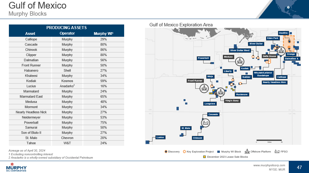 47 www.murphyoilcorp.com NYSE: MUR 47 Gulf of Mexico Murphy Blocks Acreage as of April 30, 2024 1 Excluding noncontrolling interest 2 Anadarko is a wholly - owned subsidiary of Occidental Petroleum PRODUCING ASSETS Murphy WI 1 Operator Asset 29% Murphy Calliope 80% Murphy Cascade 86% Murphy Chinook 80% Murphy Clipper 56% Murphy Dalmatian 50% Murphy Front Runner 27% Shell Habanero 34% Murphy Khaleesi 59% Kosmos Kodiak 16% Anadarko 2 Lucius 24% Murphy Marmalard 65% Murphy Marmalard East 48% Murphy Medusa 34% Murphy Mormont 27% Murphy Nearly Headless Nick 53% Murphy Neidermeyer 75% Murphy Powerball 50% Murphy Samurai 27% Murphy Son of Bluto II 20% Chevron St. Malo 24% W&T Tahoe Gulf of Mexico Exploration Area GC WR EW KC GB MC DC LU AT LL HE VK DD Miles 50 0 Offshore Platform FPSO Murphy WI Block Discovery Key Exploration Project Kodiak Front Runner Medusa Eden Park Calliope Nearly Headless Nick Guilder Silver Dollar West Silver Dollar Liberty Longclaw Powerball Ninja Cascade Chinook Lucius St. Malo Whydah/Leibniz/ Guadalupe December 2023 Lease Sale Blocks Delta House Rushmore King’s Quay Ocotillo Orange Dalmatian S.
