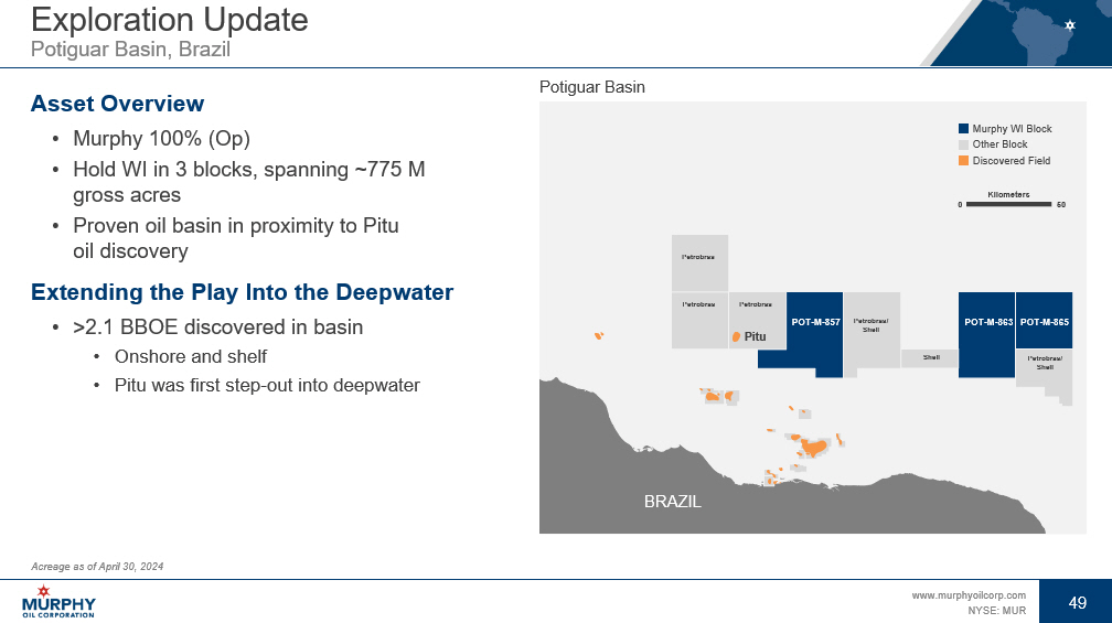 48 www.murphyoilcorp.com NYSE: MUR 48 Exploration Update Sergipe - Alagoas Basin, Brazil Asset Overview • ExxonMobil 50% (Op), Enauta Energia S.A. 30%, Murphy 20% • Hold WI in 9 blocks, spanning >1.6 MM gross acres • >2.8 BN BOE discovered in basin • >1.2 BN BOE in deepwater since 2007 • Evaluating next steps with partners Sergipe - Alagoas Basin All blocks begin with SEAL - M 0 50 Kilometers 351 428 430 503 505 501 575 573 637 Murphy WI Block Other Block Discovered Field BRAZIL Acreage as of April 30, 2024