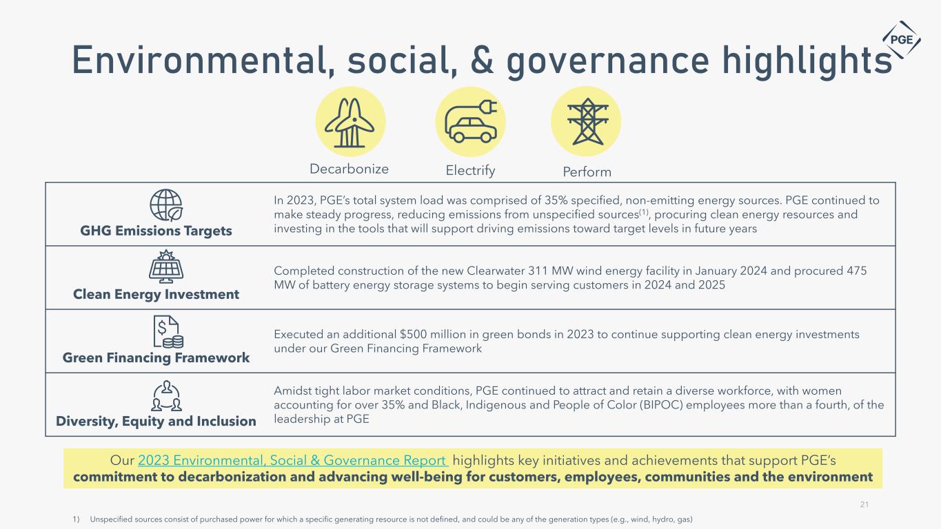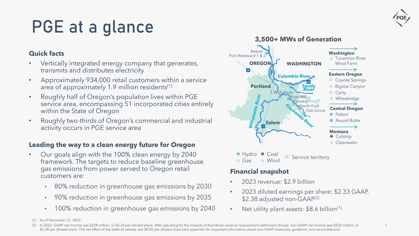 Cautionary statement 2 Investor Relations Contacts Information Current as of April 26, 2024 Except as expressly noted, the information in this presentation is current as of April 26, 2024 – the date on which PGE filed its Quarterly Report on Form 10-Q for the quarter ended March 31, 2024 - and should not be relied upon as being current as of any subsequent date. PGE undertakes no duty to update this presentation, except as may be required by law. Forward-Looking Statements This presentation contains forward-looking statements withing the meaning of the Private Securities Litigation Reform Act of 1995. Forward-looking statements are based on assumptions about the future, involve risks and uncertainties, and are not guarantees. Future results may differ materially from those expressed or implied in any forward-looking statement. These forward-looking statements represent our estimates and assumptions only as of the date set above. The company assumes no obligation to update or revise any forward-looking statement as a result of new information, future events or otherwise. Forward-looking statements include statements regarding the Company's full-year earnings guidance (including assumptions and expectations regarding annual retail deliveries, average hydro conditions, wind generation, normal thermal plant operations, operating and maintenance expense and depreciation and amortization expense) as well as other statements containing words such as "anticipates," “assumptions,” “based on,” "believes," "conditioned upon," “considers,” “could,” "estimates," "expects," “forecast,” “goals,” “intends,” “needs,” “plans,” “predicts,” “projects,” “promises,“ “seeks,” "should," “subject to,” “targets,” “will continue,” “will likely result,” or similar expressions. Investors are cautioned that any such forward-looking statements are subject to risks and uncertainties, including, without limitation: the timing or outcome of various legal and regulatory actions; changing customer expectations and choices that may reduce demand for electricity; the sale of excess energy during periods of low demand or low wholesale market prices; operational risks relating to the Company's generation and battery storage facilities, including hydro conditions, wind conditions, disruption of transmission and distribution, disruption of fuel supply, and unscheduled plant outages, which may result in unanticipated operating, maintenance and repair costs, as well as replacement power costs; delays in the supply chain and increased supply costs (including application of tariffs impacting solar module imports), failure to complete capital projects on schedule or within budget, failure of counterparties to perform under agreement, or the abandonment of capital projects, which could result in the Company's inability to recover project costs, or impact our competitive position, market share, revenues and project margins in material ways; default or nonperformance of counterparties from whom PGE purchases capacity or energy, which require the purchase of replacement power and renewable attributes at increased costs; complications arising from PGE’s jointly-owned plant, including ownership changes, regulatory outcomes or operational failures; the costs of compliance with environmental laws and regulations, including those that govern emissions from thermal power plants; changes in weather, hydroelectric and energy market conditions, which could affect the availability, cost and required collateral for purchased power and fuel; changes in capital and credit market conditions, including volatility of equity markets, reductions in demand for investment-grade commercial paper or interest rates, which could affect the access to and availability or cost of capital and result in delay or cancellation of capital projects or execution of the Company’s strategic plan as currently envisioned; general economic and financial market conditions, including inflation; the effects of climate change, whether global or local in nature; unseasonable or severe weather conditions, wildfires, and other natural phenomena and natural disasters that could result in operational disruptions, unanticipated restoration costs, third party liability or that may affect energy costs or consumption; the effectiveness of PGE’s risk management policies and procedures; PGE’s ability to effectively implement Public Safety Power Shutoffs (PSPS) and de-energize its system in the event of heightened wildfire risk; cyber security attacks, data security breaches, physical attacks and security breaches, or other malicious acts, which could disrupt operations, require significant expenditures, or result in claims against the Company; employee workforce factors, including potential strikes, work stoppages, transitions in senior management, and the ability to recruit and retain key employees and other talent and turnover due to macroeconomic trends; widespread health emergencies or outbreaks of infectious diseases such as COVID-19, which may affect our financial position, results of operations and cash flows; failure to achieve the Company’s greenhouse gas emission goals or being perceived to have either failed to act responsibly with respect to the environment or effectively responded to legislative requirements concerning greenhouse gas emission reductions; social attitudes regarding the electric utility and power industries; political and economic conditions; acts of war or terrorism; changes in financial or regulatory accounting principles or policies imposed by governing bodies; changes in effective tax rate; and risks and uncertainties related to All-Source RFP projects, including, but not limited to, regulatory processes, transmission capabilities, system interconnections, permitting and construction delays, legislative uncertainty, inflationary impacts, supply costs and supply chain constraints. 