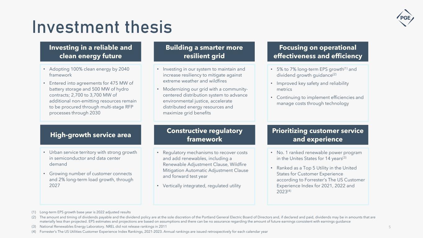 4 PGE at a glance 3,500+ MWs of Generation Quick facts • Vertically integrated energy company that generates, transmits and distributes electricity • Approximately 934,000 retail customers within a service area of approximately 1.9 million residents(1) • Roughly half of Oregon’s population lives within PGE service area, encompassing 51 incorporated cities entirely within the State of Oregon • Roughly two-thirds of Oregon’s commercial and industrial activity occurs in PGE service area Leading the way to a clean energy future for Oregon • Our goals align with the 100% clean energy by 2040 framework. The targets to reduce baseline greenhouse gas emissions from power served to Oregon retail customers are: • 80% reduction in greenhouse gas emissions by 2030 • 90% reduction in greenhouse gas emissions by 2035 • 100% reduction in greenhouse gas emissions by 2040 (1) As of December 31, 2023 (2) In 2023, GAAP net income was $228 million, or $2.33 per diluted share. After adjusting for the impacts of Boardman revenue requirement settlement charge, non-GAAP net income was $233 million, or $2.38 per diluted share. The net effect of the deferral release was $0.05 per diluted share (see appendix for important information about non-GAAP measures, guidance, and reconciliations) Gas Hydro Coal Wind Service territory Beaver Port Westward 1 & 2 WASHINGTONOREGON Portland Oak Grove I-5 26 84 Columbia River Sandy River Salem North Fork River Mill T.W. Sullivan Faraday Colstrip Montana Eastern Oregon Central Oregon Washington Tucannon River Wind Farm Coyote Springs Biglow Canyon Carty Pelton Round Butte Wheatridge Financial snapshot • 2023 revenue: $2.9 billion • 2023 diluted earnings per share: $2.33 GAAP, $2.38 adjusted non-GAAP(2) • Net utility plant assets: $8.6 billion(1) Clearwater