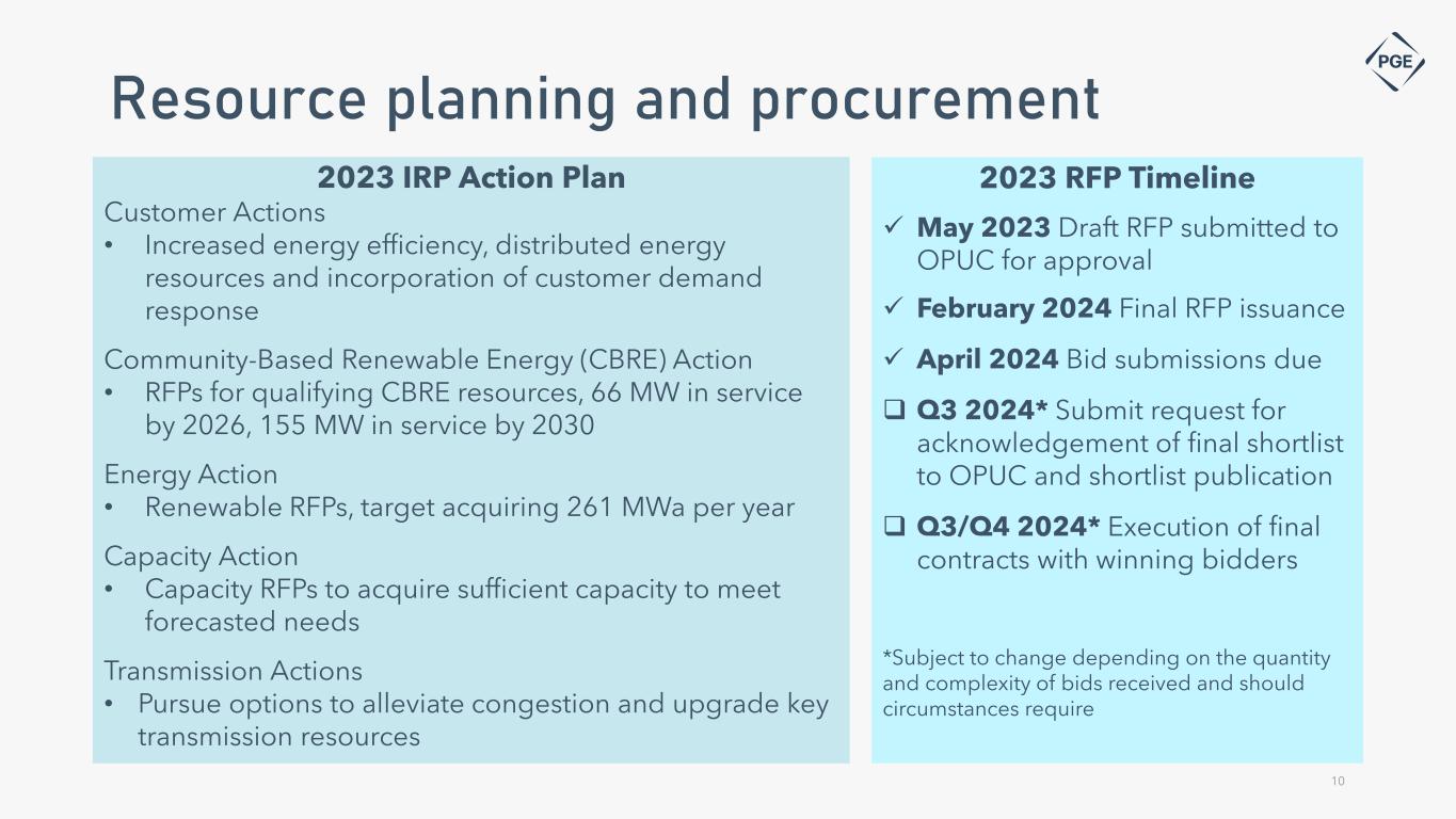 Advancing toward a clean energy future PGE has made significant progress toward decarbonization in the past decade Meaningful steps underway to meet 2030 emissions targets: • Removing coal from our portfolio to meet our legislative requirement • Clearwater Wind Development placed in service in January 2024, bringing online 311 MW of non- emitting energy, and entered into agreements for 475 MW of battery storage and 500 MW of hydro contracts • 2,700 to 3,700 MW of additional non-emitting resources remain to be procured through multi- stage RFP processes through 2030 Our decarbonization strategy is multi-faceted to support reliable and affordable power: • Clean energy • Customer-sited solutions • Technology and innovation • Regional solutions to resource adequacy Clean energy transition 9