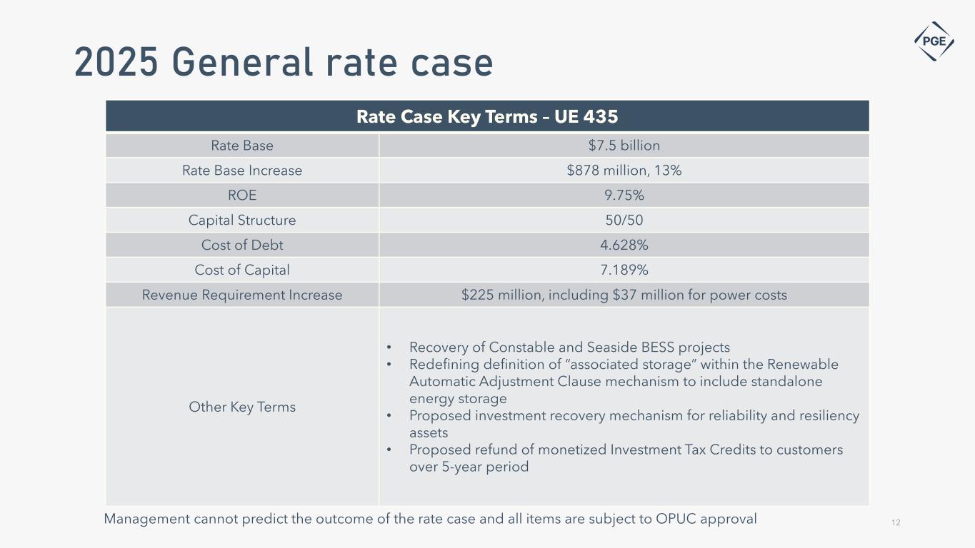 • PGE’s five-year base capital expenditure forecast of $6.2 billion drives 8% average rate base growth, from 2022 base year • Illustrative incremental RFP opportunities(2) potentially increase average rate base growth to 10%, from 2022 base year Note: Amounts presented are for illustrative purposes and represent potential values based on the assumptions outlined below. Amounts do not represent guidance and actual amounts may differ materially (1) 2022 rate base value based on UE 394 2022 GRC Rate Base amount, inclusive of Colstrip (2) 2024 beginning rate base is assumed consistent with the stipulated 2024 GRC value ($6.2B) plus capex of $424M for the Clearwater wind project (3) Base scenario illustrates the potential impact of the following assumptions: a) 2024 beginning earnings power rate base is assumed consistent with the stipulated 2024 GRC value ($6.2B) plus capex of $424M for the Clearwater wind project; b) annual capital expenditures from 2024-2028 consistent with current capital expenditures forecast on slide 8; c) 2024 depreciation and amortization of $500M (mid-point of 2024 earnings guidance assumption); d) multi-year closing of transmission capex to rate-base, and; e) 25-year useful life for new asset additions thereafter (4) The base capital + incremental opportunity from RFPs illustrates the potential impact of the following assumptions: a) a total remaining IRP opportunity of 3,200 MW (mid-point of remaining resource need of 2,700 to 3,700 MW, including both energy and capacity resources); b) 25% ownership of the midpoint 3,200 MW opportunity; c) $1,900 installed cost per KW (based on indicative values for 2021 RFP PGE-Owned Resources); d) RFP projects procured in serial cycles and with evenly spread project spend through year-end 2029 (Note: This is illustrative and actual RFP opportunity spend may be unevenly distributed); and e) 25-year useful life for RFP asset additions Illustrative rate base growth 11 8% CAGR 10% CAGR $5.6 $5.9 $7.0 $7.6 $8.1 $8.5 $8.9 $7.8 $8.6 $9.3 $10.0 2022 2023 2024E 2025E 2026E 2027E 2028E Base Capital Base Capital + Remaining RFP Opportunity $ B ill io ns (2) (3) (1) (4)
