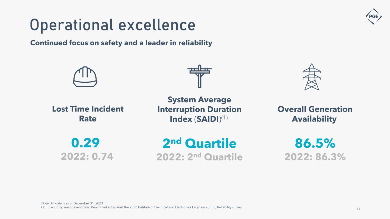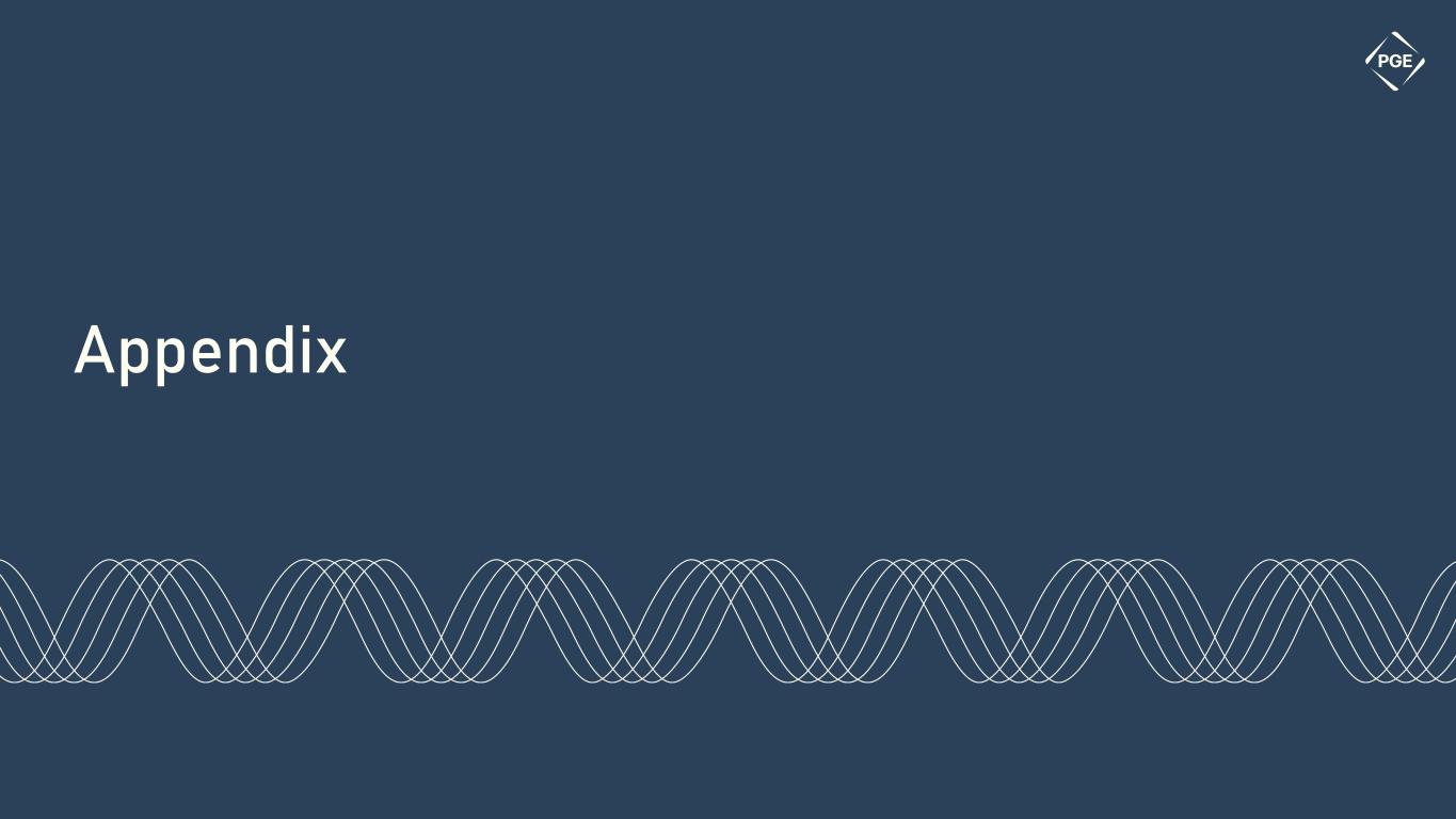High Fire Risk Zones (brightly shaded) within PGE’s service territory (outlined) 1) Per PGE’s 2024 Wildfire Mitigation Plan. Amount calculated using the midpoint of the $43 - $49.2 forecasted capital costs Public Safety Power Shutoff 2 In response to extreme conditions, PGE has successfully implemented two Public Safety Power Shutoffs (PSPS), one in 2020 and one in 2022 to protect lives, property and public spaces SITUATIONAL AWARENESS Improve PGE’s wildfire-related risk management and situational awareness capabilities SYSTEM HARDENING Implement a systematic, risk-informed approach to identify and prioritize system hardening and resiliency measures to avoid potential fires and protect PGE assets OPERATIONAL PRACTICES Implement operational system settings, including protection systems, line and vegetation maintenance, and using a risk-informed protection strategy to reduce risk of ignitions PSPS PGE turns off power in a limited, high-risk area to help reduce the risk of wildfire and to help protect people, property and the environment 29 System Hardening And Situational Awareness HFRZ camera detection and weather station coverage Percent of distribution lines that are undergrounded in PGE’s service territory50% 100% Forecasted 2024 Wildfire Mitigation spend1$91M Operational Practices Percent of PGE service territory identified as HFRZ Percent of PGE customers within HFRZs2.4% 9% Defined high risk fire zones (HFRZs) within PGE’s service territory11 Percent of PGE’s overhead system located within a HFRZ4% Reclosers throughout HFRZs, enabling operational readiness and protection during fire season 78 PGE’s wildfire risk mitigation hierarchy