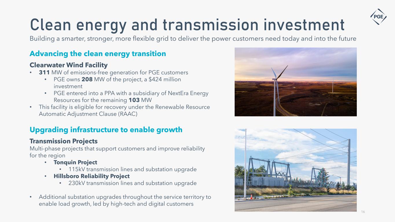 Customer focus PGE PROGRAMS Enrolled over 69,000(3) households in our Income Qualified Bill Discount Program, 80% program satisfaction rate of households surveyed CUSTOMER SATISFACTION Ranked in the top decile nationwide for Residential Customer Delight according to Escalent’s National Energy Utility Benchmarking Study (2023) (1) #1 Continued position as number 1 ranked renewable power program in the United States for 14 years according to the National Renewable Energy Laboratory (2023) (2) (1) Annual rankings are issued retrospectively for each calendar year (2) NREL did not release rankings in 2011 (3) Amount enrolled as of December 31, 2023 Ranked as a Top 5 Utility in the United States for Customer Experience according to Forrester’s The US Customer Experience Index for 2021, 2022 and 2023 (1)5 15 TOP