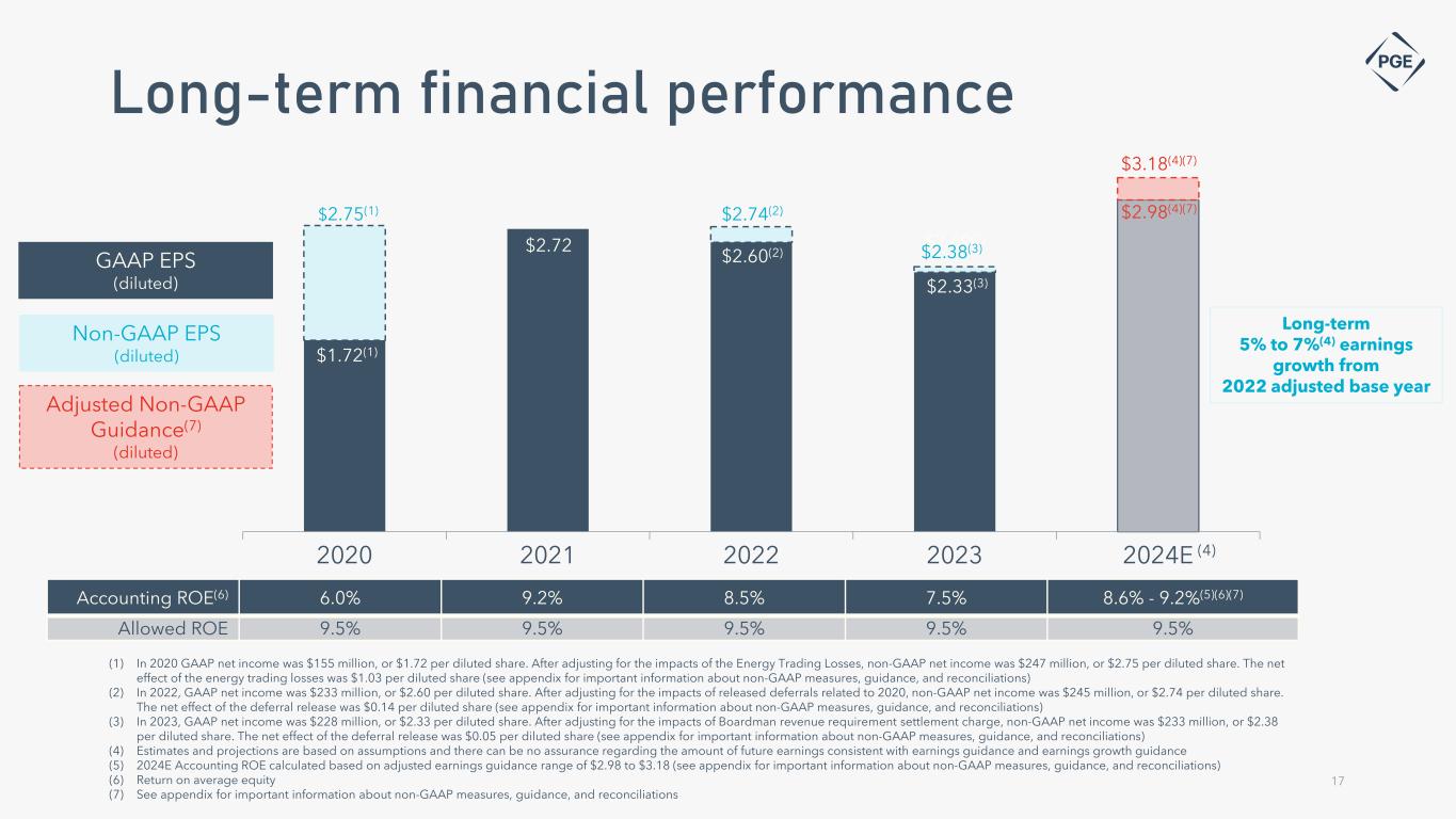 Clean energy and transmission investment Clearwater Wind Facility • 311 MW of emissions-free generation for PGE customers • PGE owns 208 MW of the project, a $424 million investment • PGE entered into a PPA with a subsidiary of NextEra Energy Resources for the remaining 103 MW • This facility is eligible for recovery under the Renewable Resource Automatic Adjustment Clause (RAAC) Building a smarter, stronger, more flexible grid to deliver the power customers need today and into the future 16 Transmission Projects Multi-phase projects that support customers and improve reliability for the region • Tonquin Project • 115kV transmission lines and substation upgrade • Hillsboro Reliability Project • 230kV transmission lines and substation upgrade • Additional substation upgrades throughout the service territory to enable load growth, led by high-tech and digital customers Advancing the clean energy transition Upgrading infrastructure to enable growth
