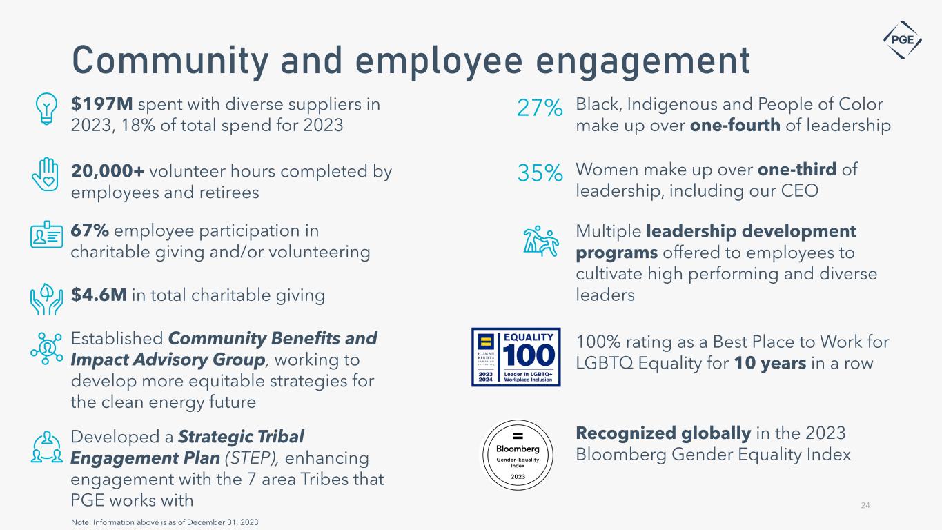 our Green Financing Framework under which we issue green financing instruments to finance or refinance sustainable projects Adopted $100M in green bonds, which were funded in 2023, supporting the development of Constable and Seaside battery projects Issued $500M in green bonds to support the Seaside battery project and future renewable projects Issued $150M in inaugural green bonds to finance the first-of- its scale Wheatridge renewable facility Issued a $499M equity forward agreement, a first-of-its kind Green Use of Proceeds equity offering. Proceeds support the construction of Clearwater Wind Facility and Constable battery project Executed 2021 2021 2022 2022 2023 Green financing framework 23