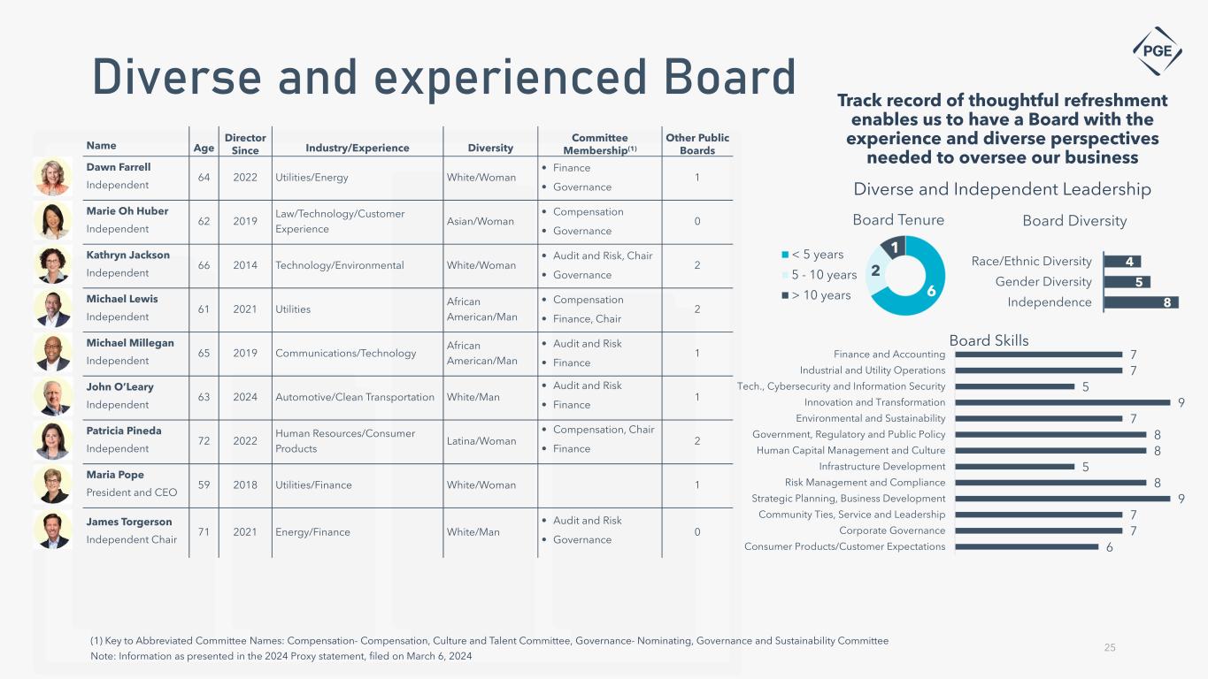 24 Community and employee engagement $197M spent with diverse suppliers in 2023, 18% of total spend for 2023 20,000+ volunteer hours completed by employees and retirees 67% employee participation in charitable giving and/or volunteering $4.6M in total charitable giving Established Community Benefits and Impact Advisory Group, working to develop more equitable strategies for the clean energy future Developed a Strategic Tribal Engagement Plan (STEP), enhancing engagement with the 7 area Tribes that PGE works with Multiple leadership development programs offered to employees to cultivate high performing and diverse leaders Women make up over one-third of leadership, including our CEO Black, Indigenous and People of Color make up over one-fourth of leadership 100% rating as a Best Place to Work for LGBTQ Equality for 10 years in a row Recognized globally in the 2023 Bloomberg Gender Equality Index 27% 35% Note: Information above is as of December 31, 2023