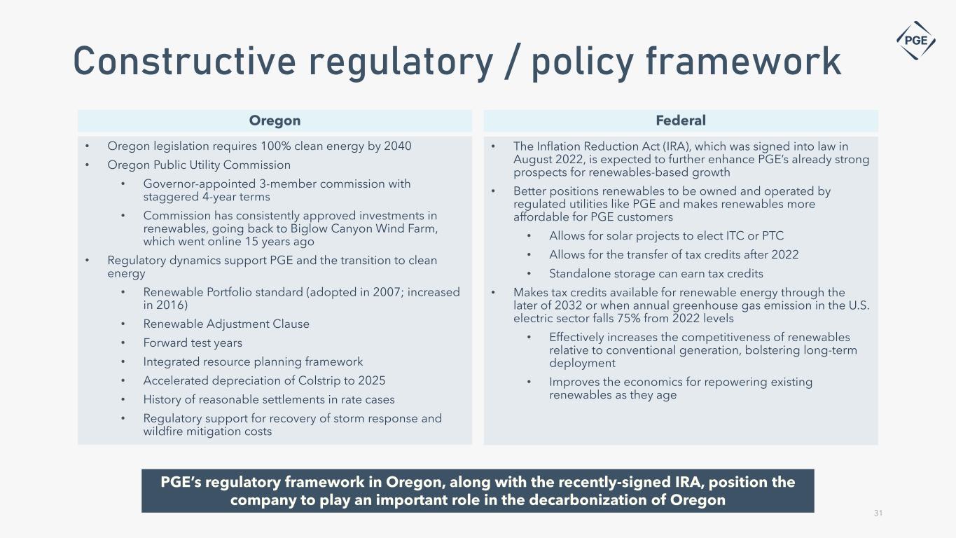 Oregon Constructive regulatory / policy framework Federal • Oregon legislation requires 100% clean energy by 2040 • Oregon Public Utility Commission • Governor-appointed 3-member commission with staggered 4-year terms • Commission has consistently approved investments in renewables, going back to Biglow Canyon Wind Farm, which went online 15 years ago • Regulatory dynamics support PGE and the transition to clean energy • Renewable Portfolio standard (adopted in 2007; increased in 2016) • Renewable Adjustment Clause • Forward test years • Integrated resource planning framework • Accelerated depreciation of Colstrip to 2025 • History of reasonable settlements in rate cases • Regulatory support for recovery of storm response and wildfire mitigation costs • The Inflation Reduction Act (IRA), which was signed into law in August 2022, is expected to further enhance PGE’s already strong prospects for renewables-based growth • Better positions renewables to be owned and operated by regulated utilities like PGE and makes renewables more affordable for PGE customers • Allows for solar projects to elect ITC or PTC • Allows for the transfer of tax credits after 2022 • Standalone storage can earn tax credits • Makes tax credits available for renewable energy through the later of 2032 or when annual greenhouse gas emission in the U.S. electric sector falls 75% from 2022 levels • Effectively increases the competitiveness of renewables relative to conventional generation, bolstering long-term deployment • Improves the economics for repowering existing renewables as they age PGE’s regulatory framework in Oregon, along with the recently-signed IRA, position the company to play an important role in the decarbonization of Oregon 31