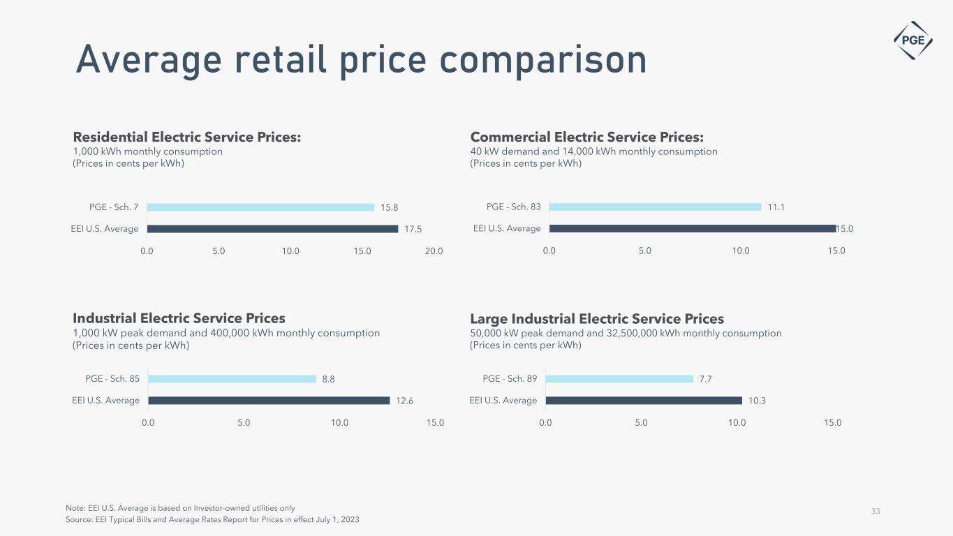 Annual power cost update tariff • Annual reset of prices based on forecast of net variable power costs (NVPC) for the coming year • Subject to OPUC prudency review and approval, new prices go into effect on or around January 1 of the following year • PGE can recover 80% of power costs prudently incurred during Reliability Contingency Events (RCEs) subject to the following criteria: • Day-Ahead Mid-C index prices exceed $150/MWh • PGE is eligible to request or acquire RA assistance through a regional RA program in which it participates • A neighboring Balancing Authority has publicly declared an event that indicates potential supply or actual supply constraints • PGE absorbs power costs/benefits, excluding the 80% RCE Cost recovery, within the deadband range. Amounts outside the deadband are shared 90% with customers and 10% with PGE, subject to an earnings test applied using the regulated ROE as a threshold • Customer surcharge occurs if PGE’s actual regulated ROE is below 8.5% (ROE will not exceed 8.5% with surcharge); Customer refund occurs if PGE’s actual regulated return is above 10.5% (regulated return will not decrease below 10.5% with refund) 9.5 10.5 8.5 R et ur n o n Eq ui ty (% ) ($15) million $30 million Customer Refund 90/10 Sharing Baseline NVPC 90/10 Sharing Customer Refund Customer Surcharge Customer Surcharge D ea d b an d Power Cost Sharing Power Cost Actuals Less RCE Costs Earnings Test 32 Detriment / (Benefit) PCAM Baseline at Year End(2): 2014 2015 2016 2017 2018 2019 2020 2021 2022 2023 Over / (Under) ($7) ($3) ($10) $15 ($3) $5 $ (13) $30(3) $23 $5 Recovery of power costs (1) Costs estimated based on framework approved within the 2024 GRC (UE 416). Future RCE costs could vary significantly based on market pricing, duration or other event specific factors (2) Dollar values in millions (3) Represents variance to baseline net of 90% of the excess variance to be collected from customers = Power Cost Actuals Less RCE Costs Total Power Cost Actuals 80% of RCE Costs 1. 2. 3.