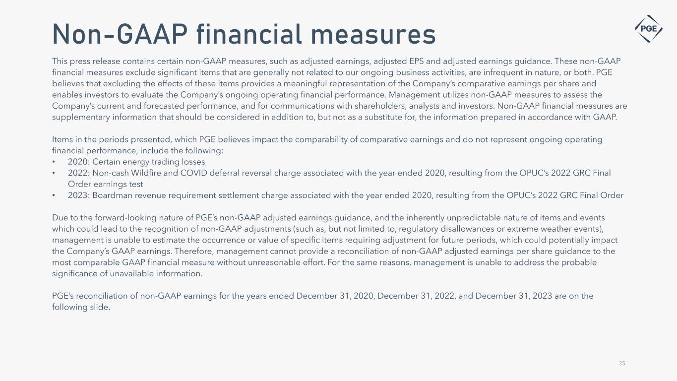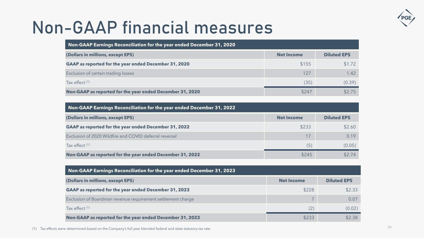 This press release contains certain non-GAAP measures, such as adjusted earnings, adjusted EPS and adjusted earnings guidance. These non-GAAP financial measures exclude significant items that are generally not related to our ongoing business activities, are infrequent in nature, or both. PGE believes that excluding the effects of these items provides a meaningful representation of the Company’s comparative earnings per share and enables investors to evaluate the Company’s ongoing operating financial performance. Management utilizes non-GAAP measures to assess the Company’s current and forecasted performance, and for communications with shareholders, analysts and investors. Non-GAAP financial measures are supplementary information that should be considered in addition to, but not as a substitute for, the information prepared in accordance with GAAP. Items in the periods presented, which PGE believes impact the comparability of comparative earnings and do not represent ongoing operating financial performance, include the following: • 2020: Certain energy trading losses • 2022: Non-cash Wildfire and COVID deferral reversal charge associated with the year ended 2020, resulting from the OPUC’s 2022 GRC Final Order earnings test • 2023: Boardman revenue requirement settlement charge associated with the year ended 2020, resulting from the OPUC’s 2022 GRC Final Order Due to the forward-looking nature of PGE’s non-GAAP adjusted earnings guidance, and the inherently unpredictable nature of items and events which could lead to the recognition of non-GAAP adjustments (such as, but not limited to, regulatory disallowances or extreme weather events), management is unable to estimate the occurrence or value of specific items requiring adjustment for future periods, which could potentially impact the Company’s GAAP earnings. Therefore, management cannot provide a reconciliation of non-GAAP adjusted earnings per share guidance to the most comparable GAAP financial measure without unreasonable effort. For the same reasons, management is unable to address the probable significance of unavailable information. PGE’s reconciliation of non-GAAP earnings for the years ended December 31, 2020, December 31, 2022, and December 31, 2023 are on the following slide. 35 Non-GAAP financial measures