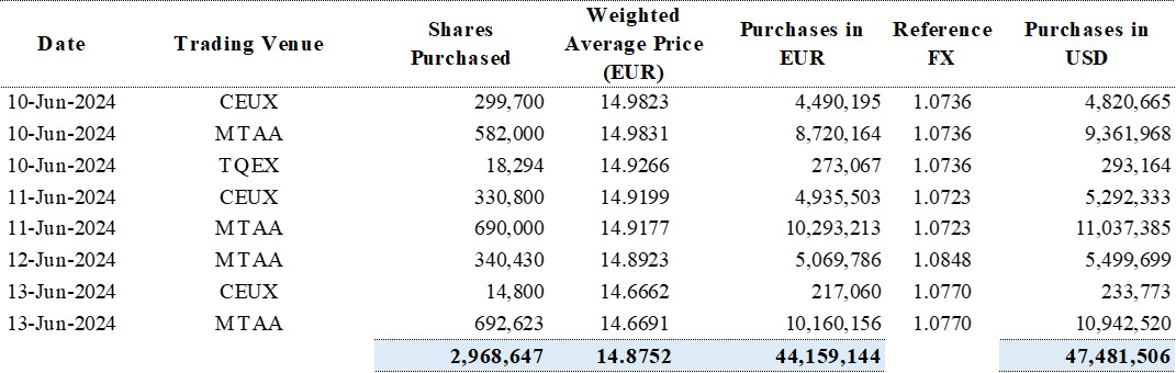 From June 10, 2024 to (and including) June 13, 2024, the Company has purchased a total of 2,968,647 ordinary shares for a total consideration of €44,159,144, equivalent to USD47,481,506.
