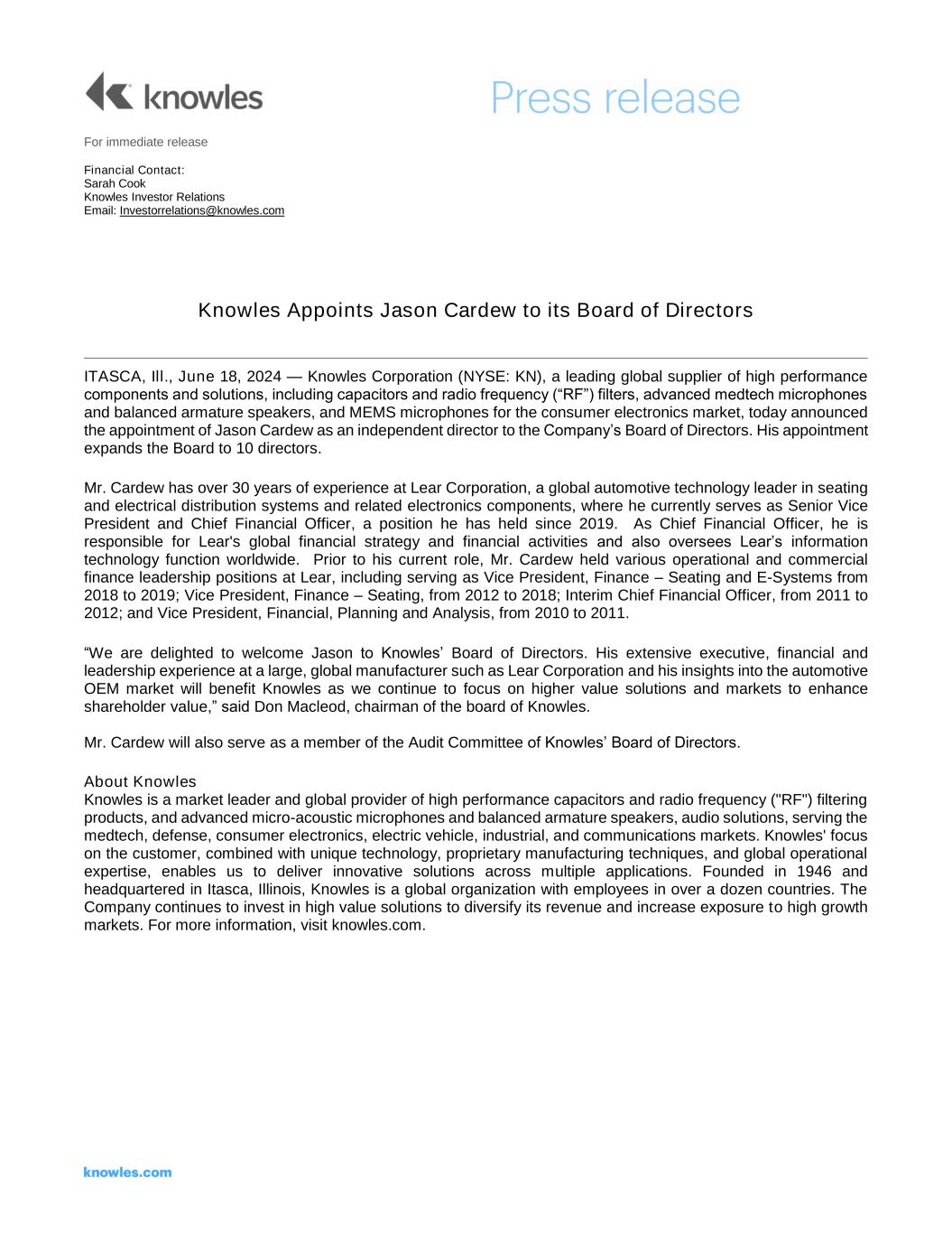On June 18, 2024, the Board of Directors (the "Board") of Knowles Corporation (the "Company") increased the size of the Board from nine persons to ten persons and elected Jason Cardew as a new director to fill the vacancy created by such increase. Mr. Cardew will hold office as a director on the Board until the Company's next annual meeting of shareholders and until his successor is duly elected and qualified or until his earlier resignation or removal. Mr. Cardew was appointed to serve on the Audit Committee of the Board. Mr. Cardew is currently Senior Vice President and Chief Financial Officer at Lear Corporation, a global automotive technology leader in seating and electrical distribution systems and related electronics components. The Board has determined that Mr. Cardew meets the standards of independence under the Company's Standards for Director Independence, as well as applicable corporate governance listing standards of the New York Stock Exchange. There is no arrangement or understanding between Mr. Cardew and any other person pursuant to which he was selected as a director. Mr.. Cardew does not have a direct or indirect interest in any transaction with the Company that would qualify as a related party transaction under Item 404(a) of Regulation S-K. Mr. Cardew will receive compensation for his service on the Board in accordance with the Company's standard compensation arrangement for non-employee directors. A description of the Company’s non-employee director compensation can be found under the heading "Directors' Compensation" in the Company’s Annual Proxy Statement filed with the Securities and Exchange Commission on March 15, 2024. This compensation generally consists of (i) an annual retainer of $235,000, payable $65,000 in cash and $170,000 in restricted stock units that vest on the first anniversary of the grant, (ii) an additional annual retainer of $10,000 for service on the Audit Committee, and (iii) a one-time grant upon election to the Board of $170,000 in restricted stock units that vest on the third anniversary of the grant. Mr. Cardew's initial annual retainer for service as a non-employee director and for service as a member of the Audit Committtee will be prorated to reflect the time he serves on the Board during his first year of service. | |||||