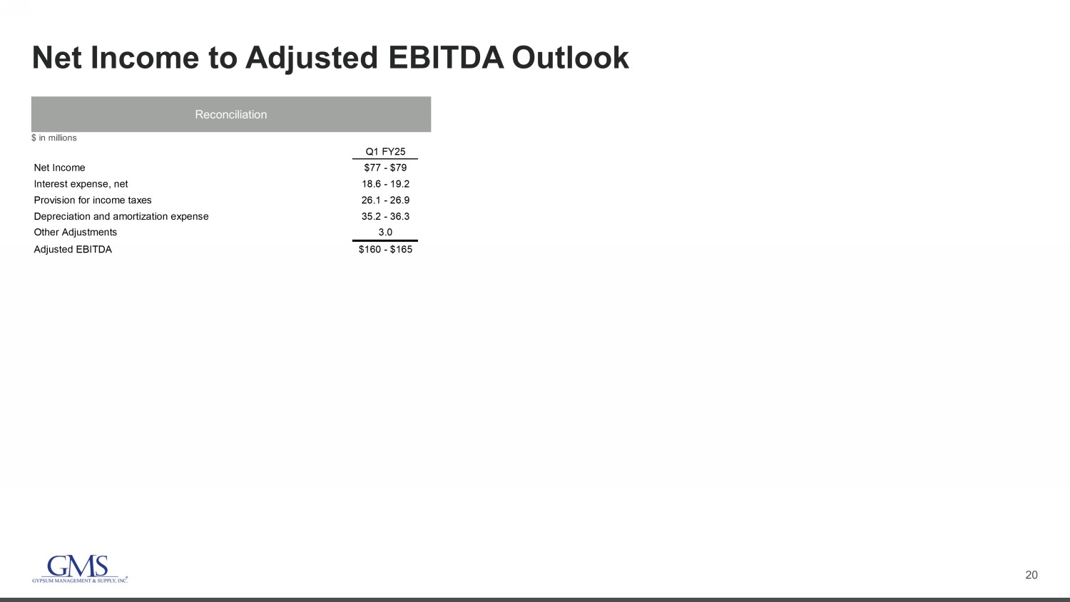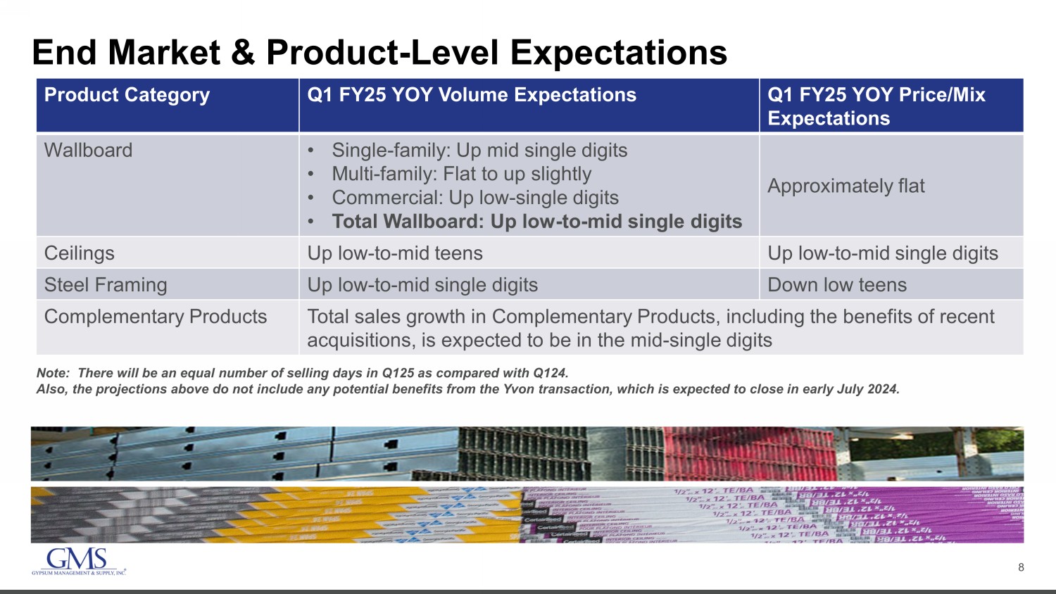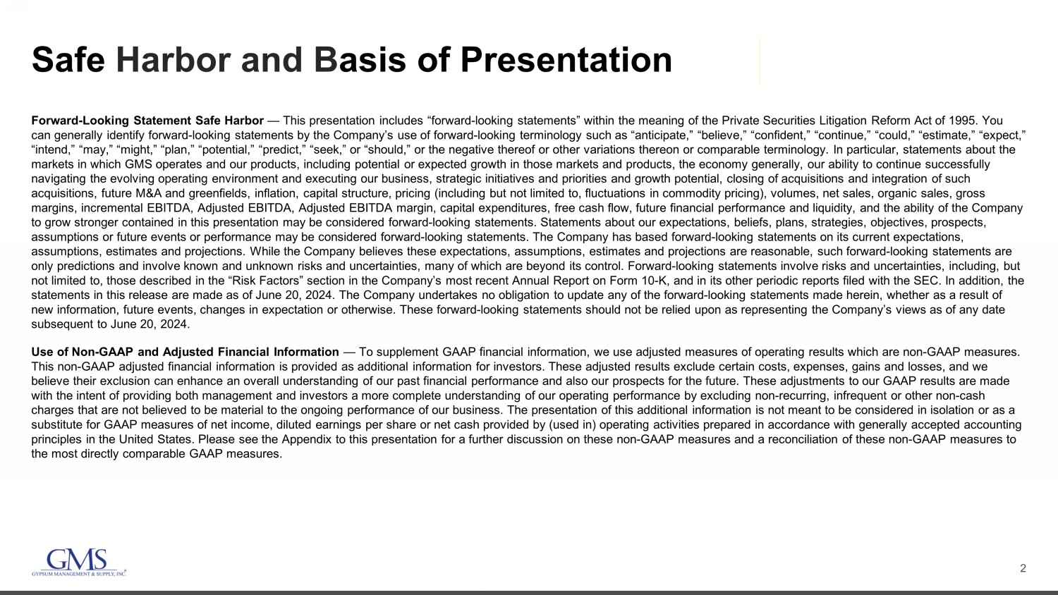 2 Safe Harbor and B asis of Presentation Forward - Looking Statement Safe Harbor — This presentation includes “forward - looking statements” within the meaning of the Private Securities Litigation Reform Act of 1995. You can generally identify forward - looking statements by the Company’s use of forward - looking terminology such as “anticipate,” “bel ieve,” “confident,” “continue,” “could,” “estimate,” “expect,” “intend,” “may,” “might,” “plan,” “potential,” “predict,” “seek,” or “should,” or the negative thereof or other variations th ere on or comparable terminology. In particular, statements about the markets in which GMS operates and our products, including potential or expected growth in those markets and products, the eco nom y generally, our ability to continue successfully navigating the evolving operating environment and executing our business, strategic initiatives and priorities and growth pot ent ial, closing of acquisitions and integration of such acquisitions, future M&A and greenfields, inflation, capital structure, pricing (including but not limited to, fluctuations i n c ommodity pricing), volumes, net sales, organic sales, gross margins, incremental EBITDA, Adjusted EBITDA, Adjusted EBITDA margin, capital expenditures, free cash flow, future financial per formance and liquidity, and the ability of the Company to grow stronger contained in this presentation may be considered forward - looking statements. Statements about our expectations, beliefs, plans, strategies, objectives, prospects, assumptions or future events or performance may be considered forward - looking statements. The Company has based forward - looking statements on its current expectations, assumptions, estimates and projections. While the Company believes these expectations, assumptions, estimates and projections ar e reasonable, such forward - looking statements are only predictions and involve known and unknown risks and uncertainties, many of which are beyond its control. Forward - looking st atements involve risks and uncertainties, including, but not limited to, those described in the “Risk Factors” section in the Company’s most recent Annual Report on Form 10 - K, and in it s other periodic reports filed with the SEC. In addition, the statements in this release are made as of June 20, 2024. The Company undertakes no obligation to update any of the forward - looki ng statements made herein, whether as a result of new information, future events, changes in expectation or otherwise. These forward - looking statements should not be relied upon as representing the Company’s views as of any date subsequent to June 20, 2024. Use of Non - GAAP and Adjusted Financial Information — To supplement GAAP financial information, we use adjusted measures of operating results which are non - GAAP measures. This non - GAAP adjusted financial information is provided as additional information for investors. These adjusted results exclude certain costs, expenses, gains and losses, and we believe their exclusion can enhance an overall understanding of our past financial performance and also our prospects for the fu ture. These adjustments to our GAAP results are made with the intent of providing both management and investors a more complete understanding of our operating performance by excl udi ng non - recurring, infrequent or other non - cash charges that are not believed to be material to the ongoing performance of our business. The presentation of this additional inf ormation is not meant to be considered in isolation or as a substitute for GAAP measures of net income, diluted earnings per share or net cash provided by (used in) operating activities pr epared in accordance with generally accepted accounting principles in the United States. Please see the Appendix to this presentation for a further discussion on these non - GAAP measure s and a reconciliation of these non - GAAP measures to the most directly comparable GAAP measures.