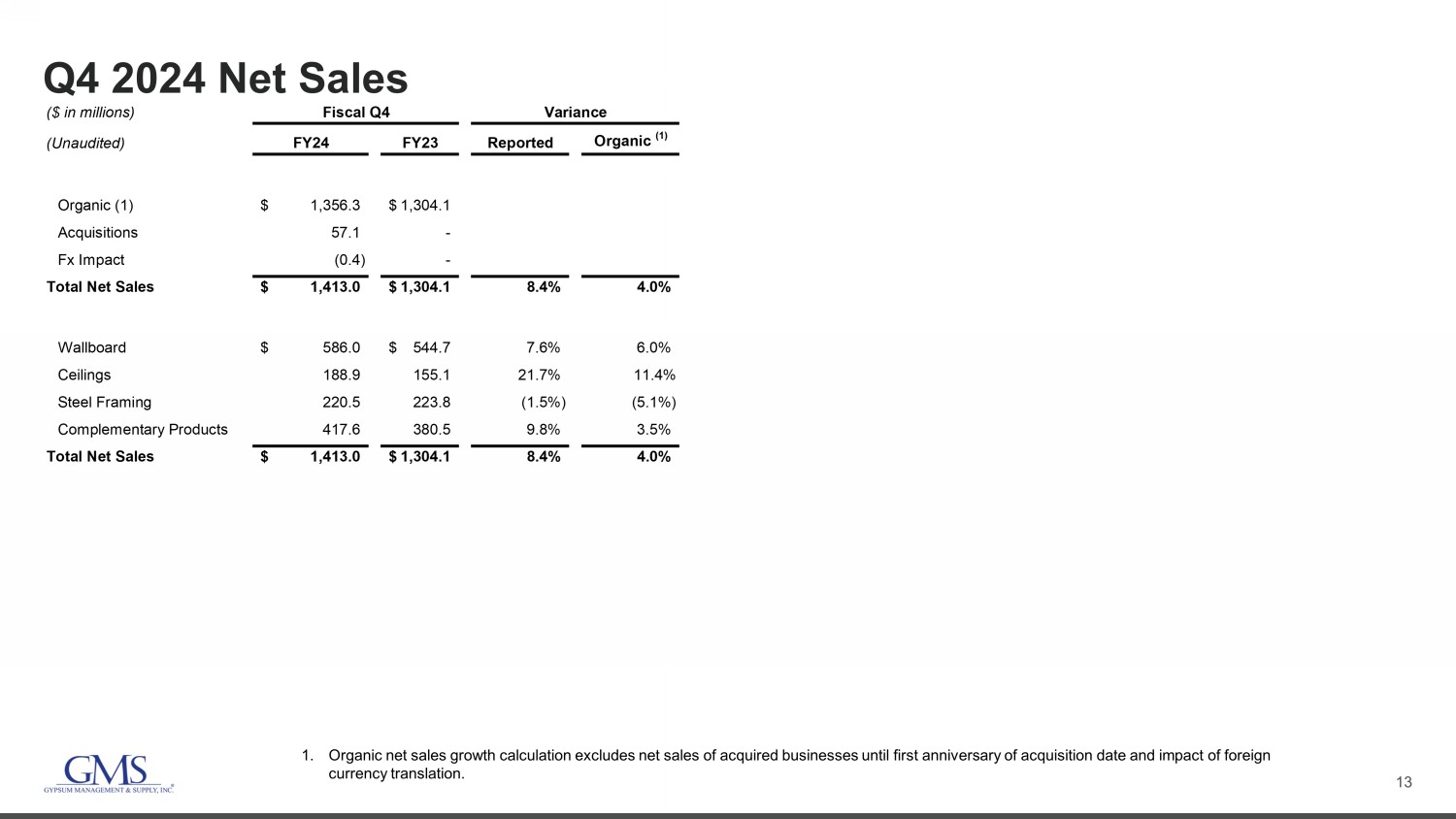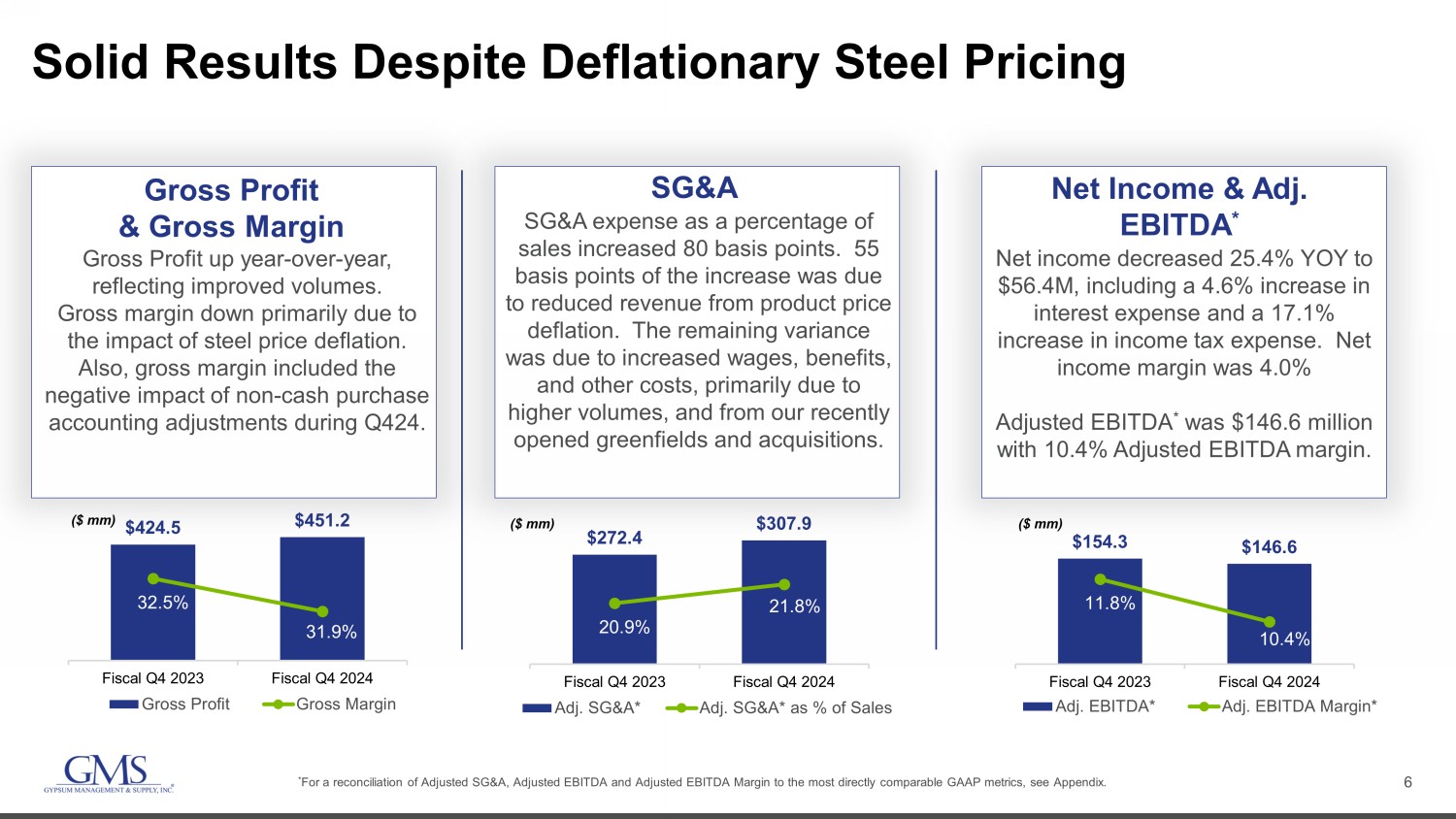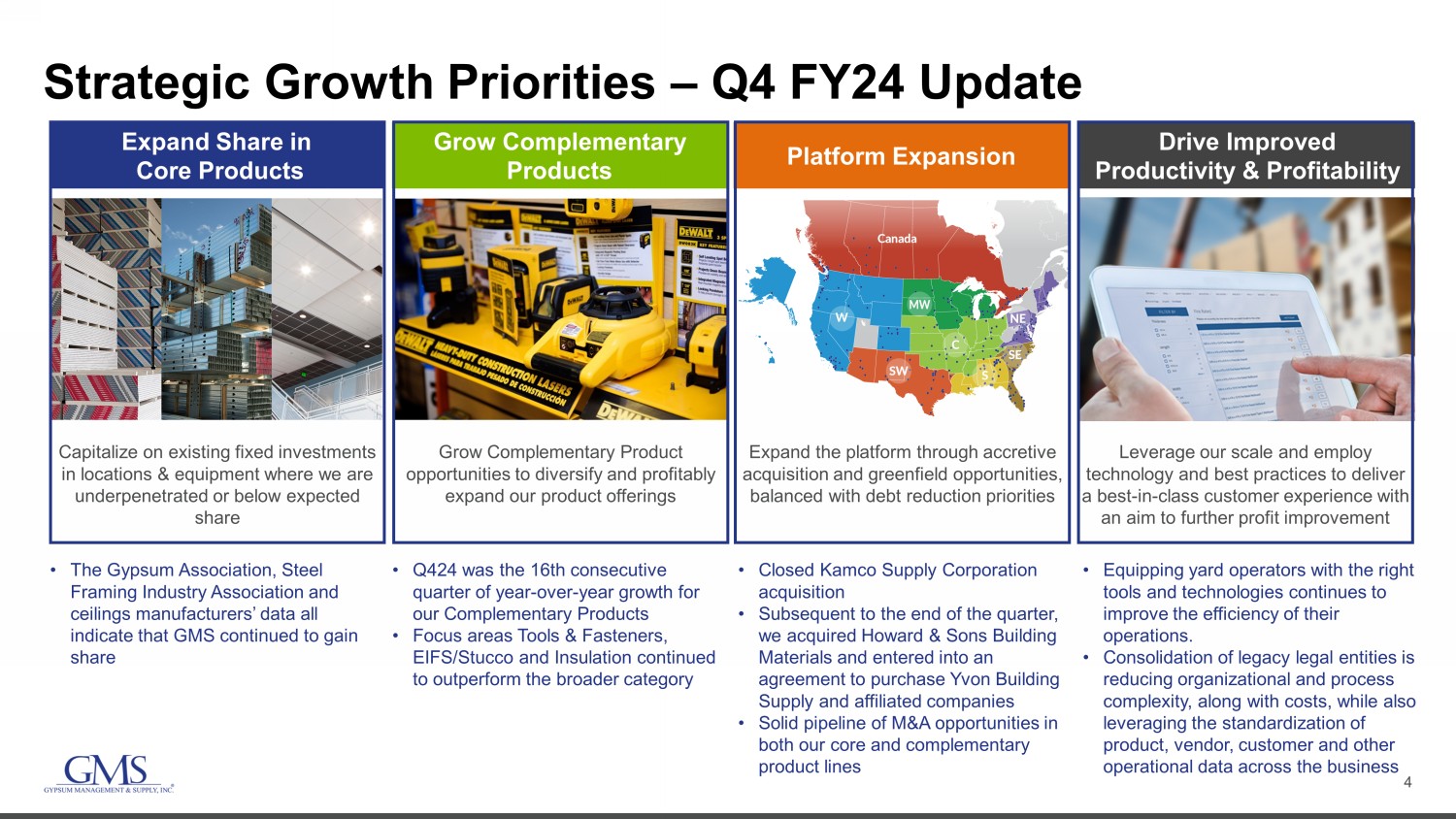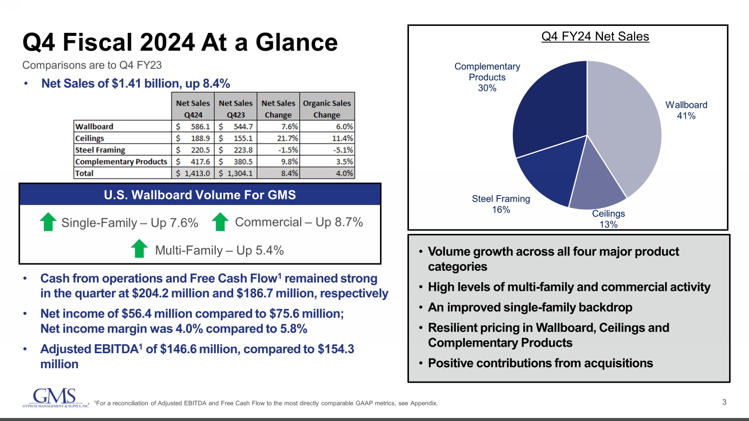 3 Q4 Fiscal 2024 At a Glance Comparisons are to Q 4 FY2 3 • Volume growth across all four major product categories • High levels of multi - family and commercial activity • An improved single - family backdrop • Resilient pricing in Wallboard, Ceilings and Complementary Products • Positive contributions from acquisitions • Net Sales of $1.41 billion, up 8.4% U.S. Wallboard Volume For GMS Multi - Family – Up 5.4% Commercial – Up 8.7% Single - Family – Up 7.6% 1 For a reconciliation of Adjusted EBITDA and Free Cash Flow to the most directly comparable GAAP metrics, see Appendix. • Cash from operations and Free Cash Flow 1 remained strong in the quarter at $204.2 million and $186.7 million, respectively • Net income of $56.4 million compared to $75.6 million; Net income margin was 4.0% compared to 5.8% • Adjusted EBITDA 1 of $146.6 million, compared to $154.3 million Q4 FY24 Net Sales Wallboard 41% Ceilings 13% Steel Framing 16% Complementary Products 30%