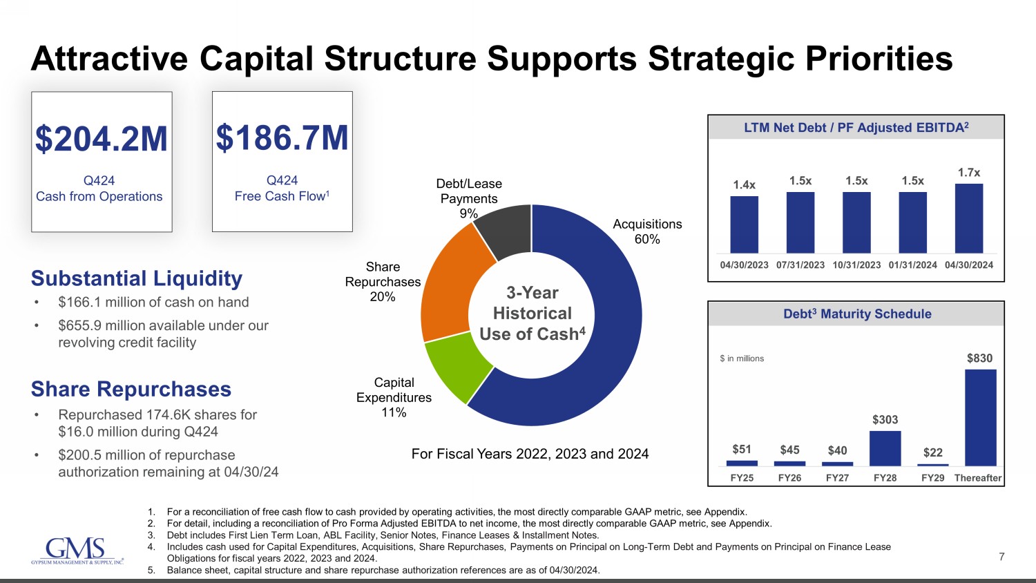 6 $424.5 $451.2 32.5% 31.9% 31.0% 31.5% 32.0% 32.5% 33.0% 33.5% $0 $50 $100 $150 $200 $250 $300 $350 $400 $450 $500 Fiscal Q4 2023 Fiscal Q4 2024 Gross Profit Gross Margin ($ mm) Solid Results Despite Deflationary Steel Pricing * For a reconciliation of Adjusted SG&A, Adjusted EBITDA and Adjusted EBITDA Margin to the most directly comparable GAAP metric s, see Appendix. $272.4 $307.9 20.9% 21.8% 18.0% 18.5% 19.0% 19.5% 20.0% 20.5% 21.0% 21.5% 22.0% 22.5% 23.0% 23.5% 24.0% 24.5% $0 $50 $100 $150 $200 $250 $300 Fiscal Q4 2023 Fiscal Q4 2024 Adj. SG&A* Adj. SG&A* as % of Sales ($ mm) $154.3 $146.6 11.8% 10.4% 9.0% 9.5% 10.0% 10.5% 11.0% 11.5% 12.0% 12.5% 13.0% 13.5% $0 $50 $100 $150 $200 Fiscal Q4 2023 Fiscal Q4 2024 Adj. EBITDA* Adj. EBITDA Margin* ($ mm) Gross Profit & Gross Margin Gross Profit up year - over - year, reflecting improved volumes. Gross margin down primarily due to the impact of steel price deflation. Also, gross margin included the negative impact of non - cash purchase accounting adjustments during Q424. SG&A SG&A expense as a percentage of sales increased 80 basis points. 55 basis points of the increase was due to reduced revenue from product price deflation. The remaining variance was due to increased wages, benefits, and other costs, primarily due to higher volumes, and from our recently opened greenfields and acquisitions. Net Income & Adj. EBITDA * Net income decreased 25.4% YOY to $56.4M, including a 4.6% increase in interest expense and a 17.1% increase in income tax expense. Net income margin was 4.0% Adjusted EBITDA * was $146.6 million with 10.4% Adjusted EBITDA margin.