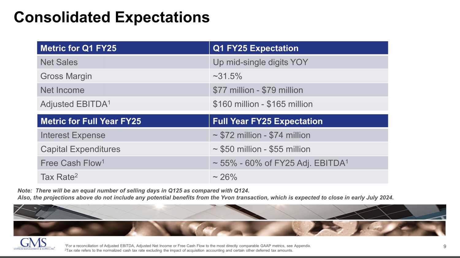 8 End Market & Product - Level Expectations Product Category Q1 FY25 YOY Volume Expectations Q1 FY25 YOY Price/Mix Expectations Wallboard • Single - family: Up mid single digits • Multi - family: Flat to up slightly • Commercial: Up low - single digits • Total Wallboard: Up low - to - mid single digits Approximately flat Ceilings Up low - to - mid teens Up low - to - mid single digits Steel Framing Up low - to - mid single digits Down low teens Complementary Products Total sales growth in Complementary Products, including the benefits of recent acquisitions, is expected to be in the mid - single digits Note: There will be an equal number of selling days in Q125 as compared with Q124. Also, the projections above do not include any potential benefits from the Yvon transaction, which is expected to close in ea rly July 2024.