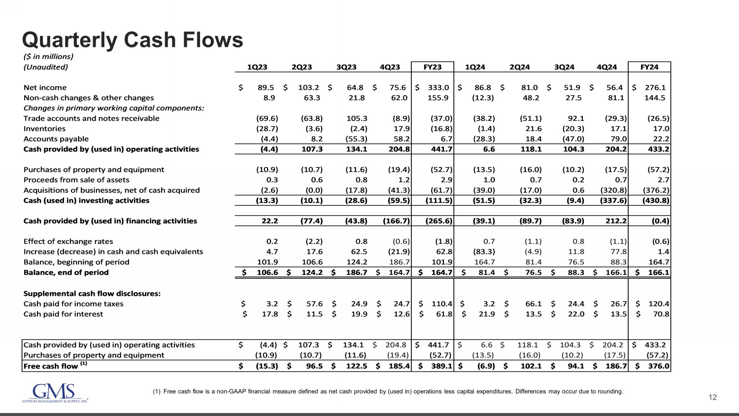11 Summary Quarterly Financials (In millions) 1Q23 2Q23 3Q23 4Q23 FY23 1Q24 2Q24 3Q24 4Q24 FY24 (Unaudited) Wallboard Volume (MSF) 1,191 1,232 1,058 1,130 4,611 1,204 1,231 1,101 1,234 4,769 Wallboard Price ($ / '000 Sq. Ft.) 438$ 474$ 473$ 481$ 467$ 475$ 476$ 473$ 475$ 475$ Wallboard 522$ 585$ 501$ 545$ 2,152$ 571$ 585$ 521$ 586$ 2,263$ Ceilings 167 160 147 155 629 175 175 156 189 695 Steel framing 275 278 234 224 1,011 237 232 203 220 893 Complementary products 396 409 353 380 1,538 426 428 379 418 1,651 Net sales 1,360 1,431 1,235 1,304 5,329 1,410 1,421 1,258 1,413 5,502 Cost of sales 925 966 832 880 3,603 959 962 844 962 3,727 Gross profit 435 465 402 424 1,726 451 459 415 451 1,775 Gross margin 32.0% 32.5% 32.6% 32.5% 32.4% 32.0% 32.3% 33.0% 31.9% 32.3% Operating expenses: Selling, general and administrative expenses 268 279 267 280 1,094 287 301 296 316 1,199 Depreciation and amortization 32 32 31 31 127 32 33 33 36 133 Total operating expenses 300 311 299 311 1,221 319 334 328 351 1,332 Operating income 135 153 103 114 505 132 125 86 100 443 Other (expense) income: Interest expense (15) (16) (17) (18) (66) (19) (19) (19) (19) (75) Write-off of discount and deferred financing costs - - - - - (1) - - (1) (2) Other income, net 2 2 2 3 8 2 2 2 3 9 Total other expense, net (13) (14) (15) (16) (58) (18) (17) (17) (17) (69) Income before taxes 122 139 88 98 448 114 108 69 83 374 Income tax expense 32 36 24 23 115 27 27 17 27 98 Net income 90$ 103$ 65$ 76$ 333$ 87$ 81$ 52$ 56$ 276$ Business Days 63 65 62 63 253 64 65 62 64 255 Net Sales by Business Day 21.6$ 22.0$ 19.9$ 20.7$ 21.1$ 22.0$ 21.9$ 20.3$ 22.1$ 21.6$ Beginning Branch Count 286 289 291 297 286 304 305 308 311 304 Added Branches 3 2 6 7 18 1 3 3 5 12 Ending Branch Count 289 291 297 304 304 305 308 311 316 316