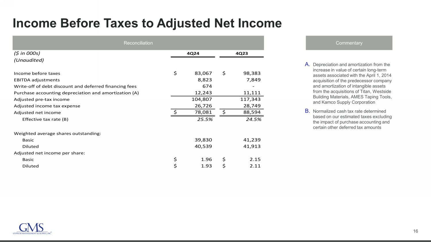 15 Net Income to Pro Forma Adjusted EBITDA Reconciliation Commentary A. Represents changes in the fair value of stock appreciation rights B. Represents changes in the fair value of noncontrolling interests C. Represents non - cash equity - based compensation expense related to the issuance of share - based awards D. Represents severance expenses and certain other cost adjustments as permitted under the ABL Facility and the Term Loan Facility E. Represents one - time costs related to our initial public offering and acquisitions paid to third party advisors as well as costs related to the retirement of corporate stock appreciation rights F. Represents the non - cash cost of sales impact of purchase accounting adjustments to increase inventory to its estimated fair value G. Represents mark - to - market adjustments for derivative financial instruments H. Represents one - time costs related to our secondary offerings paid to third party advisors I. Represents expenses paid to third party advisors related to debt refinancing activities J. Pro forma impact of earnings from acquisitions from the beginning of the LTM period to the date of acquisition, including synergies ( $ in 000s) 2024 2023 2022 2021 2020 2019 2018 2017 (Unaudited) Net Income 276,079$ 332,991$ 273,442$ 105,560$ 23,381$ 56,002$ 62,971$ 48,886$ Add: Interest Expense 75,461 65,843 58,097 53,786 67,718 73,677 31,395 29,360 Add: Write off of debt discount and deferred financing fees 2,075 - - 4,606 1,331 - 74 7,103 Less: Interest Income (1,754) (1,287) (163) (86) (88) (66) (177) (152) Add: Income Tax Expense 98,087 114,512 91,377 31,534 22,944 14,039 20,883 22,654 Add: Depreciation Expense 69,206 61,177 55,437 50,480 51,332 46,456 24,075 25,565 Add: Amortization Expense 64,156 65,730 63,795 57,645 65,201 71,003 41,455 43,675 EBITDA 583,310$ 638,966$ 541,985$ 303,525$ 231,819$ 261,111$ 180,676$ 177,091$ Adjustments Impairment of goodwill - - 63,074 - - - Stock appreciation rights (A) 5,391 7,703 4,403 3,173 1,572 2,730 2,318 148 Redeemable noncontrolling interests (B) 1,427 1,178 1,983 1,288 520 1,188 1,868 3,536 Equity-based compensation (C) 15,618 13,217 10,968 8,442 7,060 3,906 1,695 2,534 Severance and other permitted costs (D) 2,628 2,788 1,132 2,948 5,733 8,152 581 (157) Transaction costs (acquisition and other) (E) 4,856 1,961 3,545 1,068 2,414 7,858 3,370 2,249 (Gain) loss on disposal of assets (729) (1,413) (913) (1,011) 658 (525) (509) (338) Effects of fair value adjustments to inventory (F) 1,633 1,123 3,818 788 575 4,176 324 946 Gain on legal settlement - - - (1,382) (14,029) - - - Change in fair value of financial instruments (G) - - - - - 6,395 6,125 382 Secondary public offerings (H) - - - - 363 - 1,525 1,385 Debt transaction costs (I) 1,320 173 - 532 - 678 1,285 265 Total Adjustments 32,144$ 26,730$ 24,936$ 15,846$ 67,940$ 34,558$ 18,582$ 11,138$ Adjusted EBITDA (as reported) 615,454$ 665,696$ 566,921$ 319,371$ 299,759$ 295,669$ 199,258$ 188,229$ Contributions from acquisitions (J) 24,213 9,535 21,348 4,948 1,480 6,717 1,280 9,500 Pro Forma Adjusted EBITDA 639,667$ 675,231$ 588,269$ 324,319$ 301,239$ 302,386$ 200,538$ 197,729$ Net Sales $5,501,907 $5,329,252 $4,634,875 $3,298,823 $3,241,307 $3,116,032 $2,511,469 $2,319,146 Adjusted EBITDA margin (as reported) 11.2% 12.5% 12.2% 9.7% 9.2% 9.5% 7.9% 8.1%