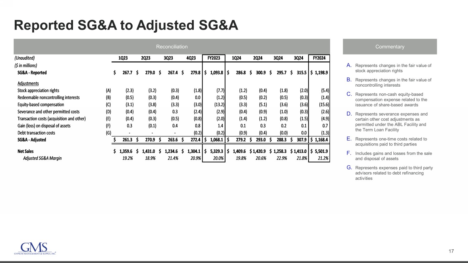 16 Income Before Taxes to Adjusted Net Income Reconciliation Commentary A. Depreciation and amortization from the increase in value of certain long - term assets associated with the April 1, 2014 acquisition of the predecessor company and amortization of intangible assets from the acquisitions of Titan, Westside Building Materials, AMES Taping Tools, and Kamco Supply Corporation B. Normalized cash tax rate determined based on our estimated taxes excluding the impact of purchase accounting and certain other deferred tax amounts ($ in 000s) 4Q24 4Q23 (Unaudited) Income before taxes 83,067$ 98,383$ EBITDA adjustments 8,823 7,849 Write-off of debt discount and deferred financing fees 674 - Purchase accounting depreciation and amortization (A) 12,243 11,111 Adjusted pre-tax income 104,807 117,343 Adjusted income tax expense 26,726 28,749 Adjusted net income 78,081$ 88,594$ Effective tax rate (B) 25.5% 24.5% Weighted average shares outstanding: Basic 39,830 41,239 Diluted 40,539 41,913 Adjusted net income per share: Basic 1.96$ 2.15$ Diluted 1.93$ 2.11$