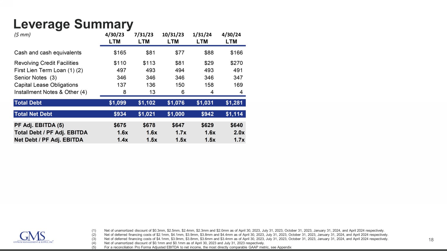 17 Reported SG&A to Adjusted SG&A Reconciliation Commentary A. Represents changes in the fair value of stock appreciation rights B. Represents changes in the fair value of noncontrolling interests C. Represents non - cash equity - based compensation expense related to the issuance of share - based awards D. Represents severance expenses and certain other cost adjustments as permitted under the ABL Facility and the Term Loan Facility E. Represents one - time costs related to acquisitions paid to third parties F. Includes gains and losses from the sale and disposal of assets G. Represents expenses paid to third party advisors related to debt refinancing activities (Unaudited) 1Q23 2Q23 3Q23 4Q23 FY2023 1Q24 2Q24 3Q24 3Q24 FY2024 ($ in millions) SG&A - Reported 267.7$ 279.0$ 267.4$ 279.8$ 1,093.8$ 286.8$ 300.9$ 295.7$ 315.5$ 1,198.9$ Adjustments Stock appreciation rights (A) (2.3) (3.2) (0.3) (1.8) (7.7) (1.2) (0.4) (1.8) (2.0) (5.4) Redeemable noncontrolling interests (B) (0.5) (0.3) (0.4) 0.0 (1.2) (0.5) (0.2) (0.5) (0.3) (1.4) Equity-based compensation (C) (3.1) (3.8) (3.3) (3.0) (13.2) (3.3) (5.1) (3.6) (3.6) (15.6) Severance and other permitted costs (D) (0.4) (0.4) 0.3 (2.4) (2.9) (0.4) (0.9) (1.0) (0.3) (2.6) Transaction costs (acquisition and other) (E) (0.4) (0.3) (0.5) (0.8) (2.0) (1.4) (1.2) (0.8) (1.5) (4.9) Gain (loss) on disposal of assets (F) 0.3 (0.1) 0.4 0.8 1.4 0.1 0.3 0.2 0.1 0.7 Debt transaction costs (G) - - - (0.2) (0.2) (0.9) (0.4) (0.0) 0.0 (1.3) SG&A - Adjusted 261.3$ 270.9$ 263.6$ 272.4$ 1,068.1$ 279.2$ 293.0$ 288.3$ 307.9$ 1,168.4$ Net Sales 1,359.6$ 1,431.0$ 1,234.6$ 1,304.1$ 5,329.3$ 1,409.6$ 1,420.9$ 1,258.3$ 1,413.0$ 5,501.9$ Adjusted SG&A Margin 19.2% 18.9% 21.4% 20.9% 20.0% 19.8% 20.6% 22.9% 21.8% 21.2%