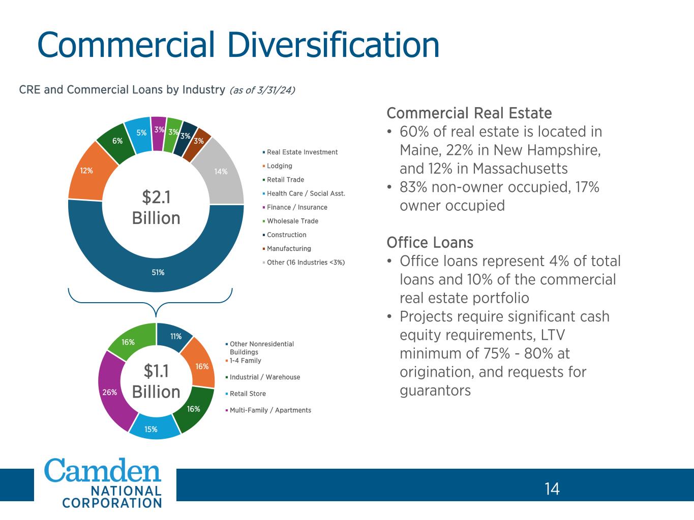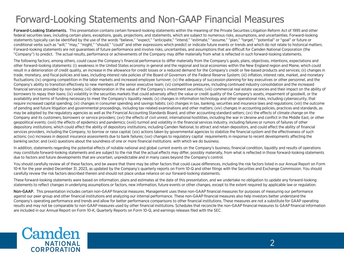 2 Forward-Looking Statements and Non-GAAP Financial Measures 2 Forward-Looking Statements. This presentation contains certain forward-looking statements within the meaning of the Private Securities Litigation Reform Act of 1995 and other federal securities laws, including certain plans, exceptions, goals, projections, and statements, which are subject to numerous risks, assumptions, and uncertainties. Forward-looking statements typically can be identified by the use of the words “believe,” “expect,” “anticipate,” “intend,” “estimate,” “assume,” “plan,” “target,” “potential” or “goal” or future or conditional verbs such as “will,” “may,” “might,” “should,” “could” and other expressions which predict or indicate future events or trends and which do not relate to historical matters. Forward-looking statements are not guarantees of future performance and involve risks, uncertainties, and assumptions that are difficult for Camden National Corporation (the “Company”) to predict. The actual results, performance or achievements of the Company may differ materially from what is reflected in such forward-looking statements. The following factors, among others, could cause the Company’s financial performance to differ materially from the Company’s goals, plans, objectives, intentions, expectations and other forward-looking statements: (i) weakness in the United States economy in general and the regional and local economies within the New England region and Maine, which could result in a deterioration of credit quality, an increase in the allowance for credit losses or a reduced demand for the Company’s credit or fee-based products and services; (ii) changes in trade, monetary, and fiscal policies and laws, including interest rate policies of the Board of Governors of the Federal Reserve System; (iii) inflation, interest rate, market, and monetary fluctuations; (iv) ongoing competition in the labor markets and increased employee turnover; (v) the adequacy of succession planning for key executives or other personnel, and the Company’s ability to transition effectively to new members of the senior executive team; (vi) competitive pressures, including continued industry consolidation and the increased financial services provided by non-banks; (vii) deterioration in the value of the Company’s investment securities; (viii) commercial real estate vacancies and their impact on the ability of borrowers to repay their loans; (ix) volatility in the securities markets that could adversely affect the value or credit quality of the Company’s assets, impairment of goodwill, or the availability and terms of funding necessary to meet the Company’s liquidity needs; (x) changes in information technology and other operational risks, including cybersecurity, that require increased capital spending; (xi) changes in consumer spending and savings habits; (xii) changes in tax, banking, securities and insurance laws and regulations; (xiii) the outcome of pending and future litigation and governmental proceedings, including tax-related examinations and other matters; (xiv) changes in accounting policies, practices and standards, as may be adopted by the regulatory agencies as well as the Financial Accounting Standards Board, and other accounting standard setters; (xv) the effects of climate change on the Company and its customers, borrowers or service providers; (xvi) the effects of civil unrest, international hostilities, including the war in Ukraine and conflict in the Middle East, or other geopolitical events; (xvii) the effects of epidemics and pandemics; (xviii) turmoil and volatility in the financial services industry, including failures or rumors of failures of other depository institutions, which could affect the ability of depository institutions, including Camden National, to attract and retain depositors, and could affect the ability of financial services providers, including the Company, to borrow or raise capital; (xix) actions taken by governmental agencies to stabilize the financial system and the effectiveness of such actions; (xx) increases in deposit insurance assessments due to bank failures; (xxi) changes to regulatory capital requirements in response to recent developments affecting the banking sector; and (xxii) questions about the soundness of one or more financial institutions with which we do business. In addition, statements regarding the potential effects of notable national and global current events on the Company’s business, financial condition, liquidity and results of operations may constitute forward-looking statements and are subject to the risk that the actual effects may differ, possibly materially, from what is reflected in those forward-looking statements due to factors and future developments that are uncertain, unpredictable and in many cases beyond the Company's control. You should carefully review all of these factors, and be aware that there may be other factors that could cause differences, including the risk factors listed in our Annual Report on Form 10-K for the year ended December 31, 2023, as updated by the Company's quarterly reports on Form 10-Q and other filings with the Securities and Exchange Commission. You should carefully review the risk factors described therein and should not place undue reliance on our forward-looking statements. These forward-looking statements were based on information, plans and estimates at the date of this presentation, and we undertake no obligation to update any forward-looking statements to reflect changes in underlying assumptions or factors, new information, future events or other changes, except to the extent required by applicable law or regulation. Non-GAAP. This presentation includes certain non-GAAP financial measures. Management uses these non-GAAP financial measures for purposes of measuring our performance against our peer group and other financial insti