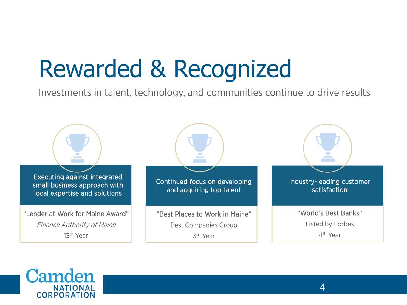 3 Overview As of March 31, 2024 $5.8 billion assets $4.6 billion deposits $4.1 billion loans $2.0 billion assets under administration Largest publicly traded bank headquartered in Northern New England (parent company of Camden National Bank) Analyst Coverage: KBW (market perform) Janney (market perform) Raymond James (market perform) Stephens (market perform) NASDA: CAC As of June 13, 2024 $455.6 million market cap. 36,500 avg. daily share volume 3