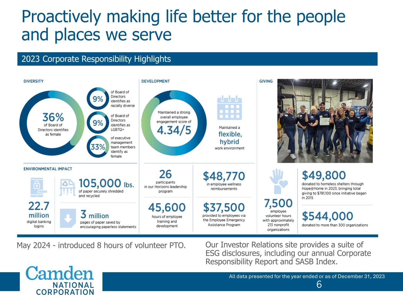 5 Deeply Engaged, Experienced Management Team Simon Griffiths President and CEO • Served as head of core banking at Citizens Bank • Joined 2023 • 22+ years of industry experience Trish Rose EVP, Retail & Mortgage Banking • 25+ years of industry experience Barbara Raths EVP, Commercial Banking • 18+ years of industry experience Mike Archer EVP, CFO • 10+ years of industry experience Garrett McKnight EVP, Managing Director, Camden National Wealth Management • 26+ years of industry experience Ryan Smith EVP, Chief Credit Officer • 28+ years of industry experience Bill Martel EVP, Chief Technology Officer • 27+ years of industry experience Andrew Forbes EVP, Chief Human Resources Officer • 1 year of industry experience Dave Ackley EVP, Chief Risk Officer • 13+ years of industry experience Renée Smyth EVP, Chief Marketing & Customer Experience Officer • 13+ years of industry experience 5
