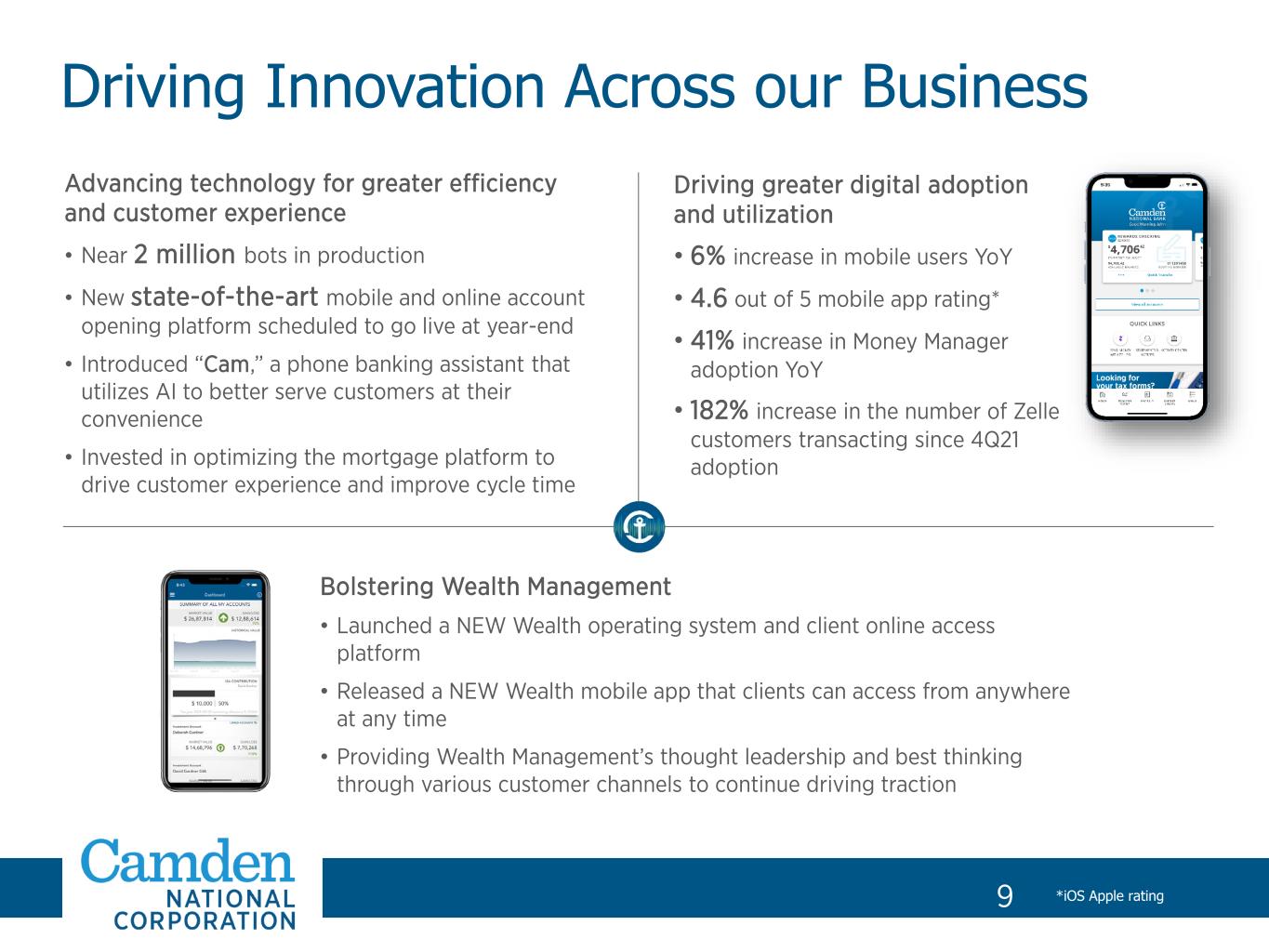 7 Why Camden National? History of strong financial performance and stable growth • Over a 10-year horizon, total return has exceeded industry peers, and total assets have grown at an 8% compounded growth rate • Strong fundamentals supported by robust capital, liquidity, and core deposits • Track record of returning capital through dividends and share repurchases • Strong credit risk culture through all economic cycles • History of successfully completing M&A Innovative community bank committed to quality growth • Focus on driving attractive new relationships and deepening existing customers • Strategic investments in technology to advance efficiencies • Enhancing customer digital platforms to increase utilization and reduce banking friction • Laser-focused customer culture, guided by a capable and experienced leadership team Proven market leader with a trusted, longstanding presence • Nearly 150 years of operating history, embedded deeply in communities served • #3 overall deposit market share in Maine, #2 in community banks(1) • #2 mortgage originator in Maine(2) • Expanding presence in higher growth markets, including Southern Maine, New Hampshire, and Northern Massachusetts 7 (1) Deposit market share data is as of 6/30/2023 (2) Mortgage origination data is as of 4/30/2024