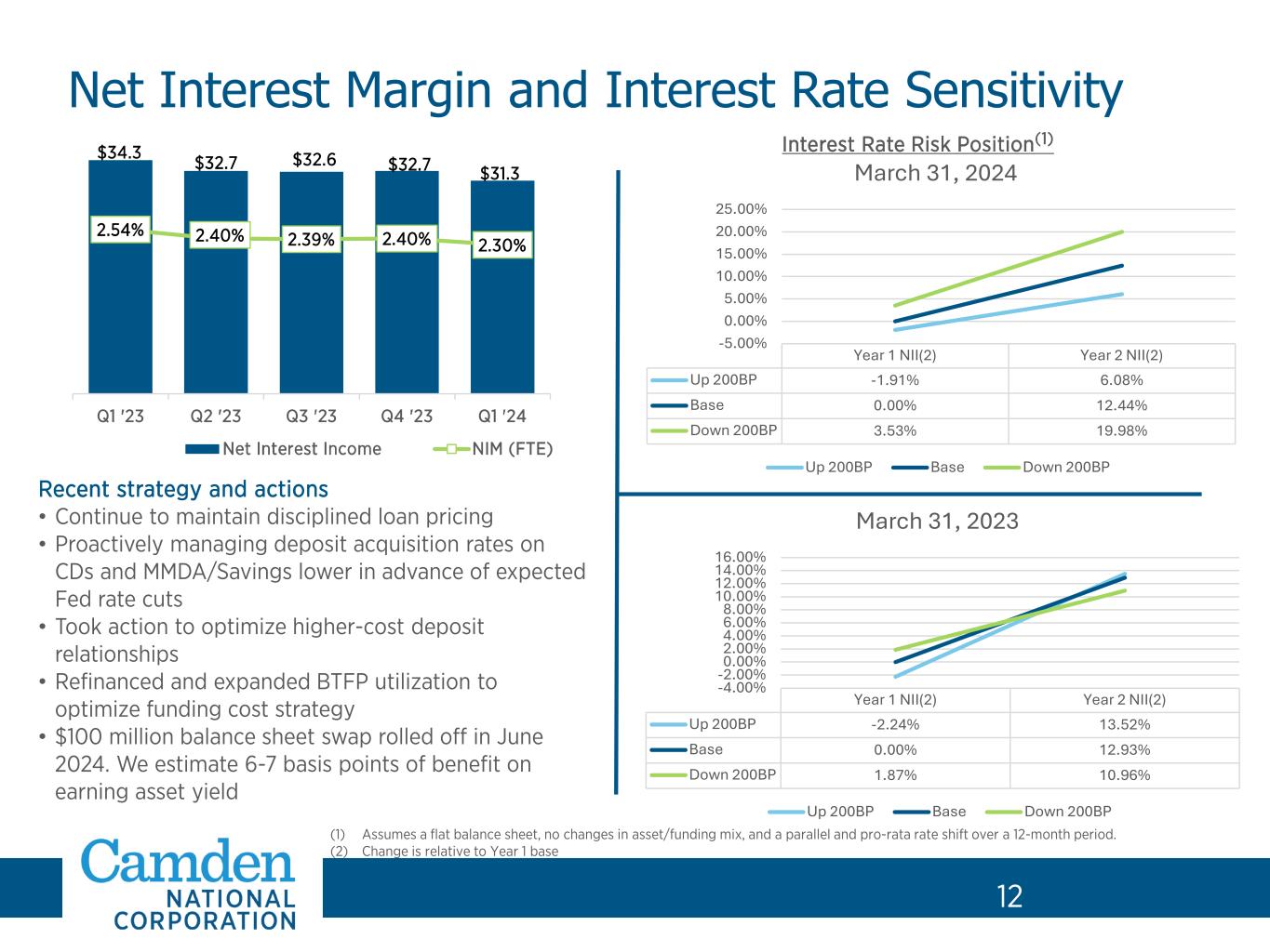 11 1Q 2024 Financial Highlights 11 • Net income for the first quarter of 2024 was $13.3 million, an increase of $4.8 million, or 57%, compared to the fourth quarter of 2023. Over the same period, adjusted net income (non-GAAP) increased $143,000, an increase of 1%. • Strong asset quality highlighted by non-performing assets of 0.13% of total assets and loans 30-89 days past due to total loans of 0.05% • Uninsured and uncollateralized deposits were 14.8% of total deposits • Available primary liquidity was 2.1x uninsured and uncollateralized deposits • Our capital position remains strong with regulatory capital ratios well in excess of required regulatory levels • As of 6/7/24 repurchased 50,000 shares of common stock at an average price of $32.19 per share Net Income $13.3 million Diluted EPS | TBV/Share $0.91 $27.82 Return on Assets | Return on Equity 0.93% 10.77% Efficiency Ratio(1) 65.55% Non-Performing Assets to Total Assets 0.13% TCE Ratio(1) 7.12% (1) This is a non-GAAP measure. Refer to the Company’s financial information filed with the SEC for the respective period. As of or for the quarter ended March 31, 2024 unless otherwise noted