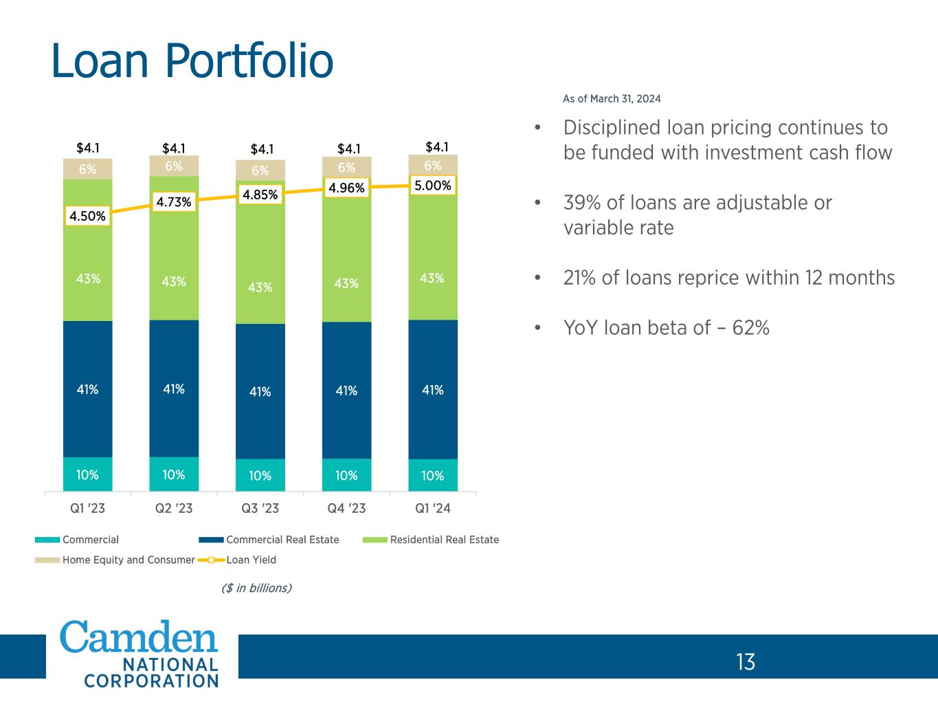 12 Year 1 NII(2) Year 2 NII(2) Up 200BP -1.91% 6.08% Base 0.00% 12.44% Down 200BP 3.53% 19.98% -5.00% 0.00% 5.00% 10.00% 15.00% 20.00% 25.00% March 31, 2024 Up 200BP Base Down 200BP Net Interest Margin and Interest Rate Sensitivity 12 2.54% 2.40% 2.39% 2.40% 2.30% 0.00% 0.50% 1.00% 1.50% 2.00% 2.50% 3.00% 3.50% 4.00% $- $5.0 $10.0 $15.0 $20.0 $25.0 $30.0 $35.0 Q1 '23 Q2 '23 Q3 '23 Q4 '23 Q1 '24 Net Interest Income NIM (FTE) $34.3 $32.7 $32.6 $32.7 $31.3 Recent strategy and actions • Continue to maintain disciplined loan pricing • Proactively managing deposit acquisition rates on CDs and MMDA/Savings lower in advance of expected Fed rate cuts • Took action to optimize higher-cost deposit relationships • Refinanced and expanded BTFP utilization to optimize funding cost strategy • $100 million balance sheet swap rolled off in June 2024. We estimate 6-7 basis points of benefit on earning asset yield Year 1 NII(2) Year 2 NII(2) Up 200BP -2.24% 13.52% Base 0.00% 12.93% Down 200BP 1.87% 10.96% -4.00% -2.00% 0.00% 2.00% 4.00% 6.00% 8.00% 10.00% 12.00% 14.00% 16.00% March 31, 2023 Up 200BP Base Down 200BP (1) Assumes a flat balance sheet, no changes in asset/funding mix, and a parallel and pro-rata rate shift over a 12-month period. (2) Change is relative to Year 1 base Interest Rate Risk Position(1)