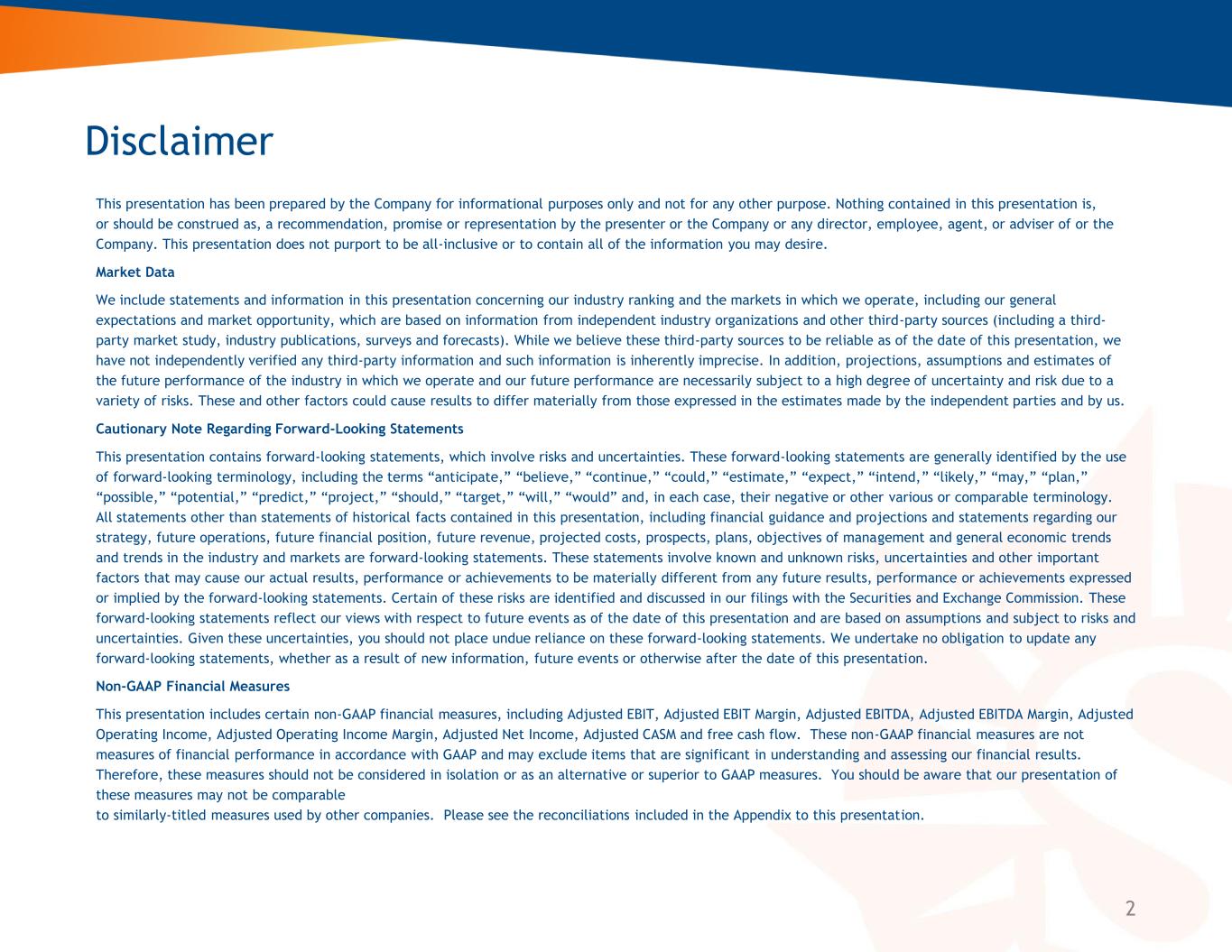 Disclaimer This presentation has been prepared by the Company for informational purposes only and not for any other purpose. Nothing contained in this presentation is, or should be construed as, a recommendation, promise or representation by the presenter or the Company or any director, employee, agent, or adviser of or the Company. This presentation does not purport to be all-inclusive or to contain all of the information you may desire. Market Data We include statements and information in this presentation concerning our industry ranking and the markets in which we operate, including our general expectations and market opportunity, which are based on information from independent industry organizations and other third-party sources (including a third- party market study, industry publications, surveys and forecasts). While we believe these third-party sources to be reliable as of the date of this presentation, we have not independently verified any third-party information and such information is inherently imprecise. In addition, projections, assumptions and estimates of the future performance of the industry in which we operate and our future performance are necessarily subject to a high degree of uncertainty and risk due to a variety of risks. These and other factors could cause results to differ materially from those expressed in the estimates made by the independent parties and by us. Cautionary Note Regarding Forward-Looking Statements This presentation contains forward-looking statements, which involve risks and uncertainties. These forward-looking statements are generally identified by the use of forward-looking terminology, including the terms “anticipate,” “believe,” “continue,” “could,” “estimate,” “expect,” “intend,” “likely,” “may,” “plan,” “possible,” “potential,” “predict,” “project,” “should,” “target,” “will,” “would” and, in each case, their negative or other various or comparable terminology. All statements other than statements of historical facts contained in this presentation, including financial guidance and projections and statements regarding our strategy, future operations, future financial position, future revenue, projected costs, prospects, plans, objectives of management and general economic trends and trends in the industry and markets are forward-looking statements. These statements involve known and unknown risks, uncertainties and other important factors that may cause our actual results, performance or achievements to be materially different from any future results, performance or achievements expressed or implied by the forward-looking statements. Certain of these risks are identified and discussed in our filings with the Securities and Exchange Commission. These forward-looking statements reflect our views with respect to future events as of the date of this presentation and are based on assumptions and subject to risks and uncertainties. Given these uncertainties, you should not place undue reliance on these forward-looking statements. We undertake no obligation to update any forward-looking statements, whether as a result of new information, future events or otherwise after the date of this presentation. Non-GAAP Financial Measures This presentation includes certain non-GAAP financial measures, including Adjusted EBIT, Adjusted EBIT Margin, Adjusted EBITDA, Adjusted EBITDA Margin, Adjusted Operating Income, Adjusted Operating Income Margin, Adjusted Net Income, Adjusted CASM and free cash flow. These non-GAAP financial measures are not measures of financial performance in accordance with GAAP and may exclude items that are significant in understanding and assessing our financial results. Therefore, these measures should not be considered in isolation or as an alternative or superior to GAAP measures. You should be aware that our presentation of these measures may not be comparable to similarly-titled measures used by other companies. Please see the reconciliations included in the Appendix to this presentation. 2