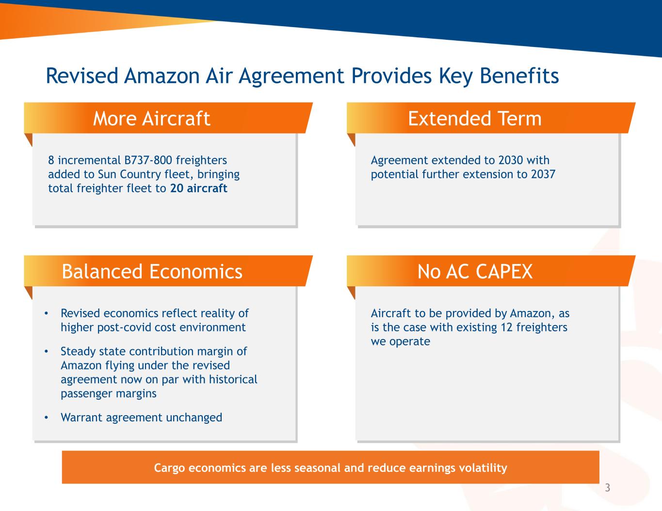 3 8 incremental B737-800 freighters added to Sun Country fleet, bringing total freighter fleet to 20 aircraft More Aircraft Revised Amazon Air Agreement Provides Key Benefits Agreement extended to 2030 with potential further extension to 2037 Extended Term Aircraft to be provided by Amazon, as is the case with existing 12 freighters we operate No AC CAPEX • Revised economics reflect reality of higher post-covid cost environment • Steady state contribution margin of Amazon flying under the revised agreement now on par with historical passenger margins • Warrant agreement unchanged Balanced Economics Cargo economics are less seasonal and reduce earnings volatility
