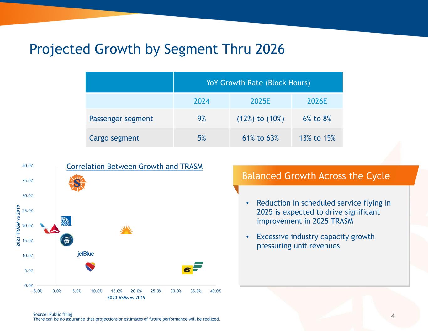 0.0% 5.0% 10.0% 15.0% 20.0% 25.0% 30.0% 35.0% 40.0% -5.0% 0.0% 5.0% 10.0% 15.0% 20.0% 25.0% 30.0% 35.0% 40.0% 2 0 2 3 T R A S M v s 2 0 1 9 2023 ASMs vs 2019 4 Projected Growth by Segment Thru 2026 YoY Growth Rate (Block Hours) 2024 2025E 2026E Passenger segment 9% (12%) to (10%) 6% to 8% Cargo segment 5% 61% to 63% 13% to 15% • Reduction in scheduled service flying in 2025 is expected to drive significant improvement in 2025 TRASM • Excessive industry capacity growth pressuring unit revenues Balanced Growth Across the Cycle Correlation Between Growth and TRASM Source: Public filing There can be no assurance that projections or estimates of future performance will be realized.