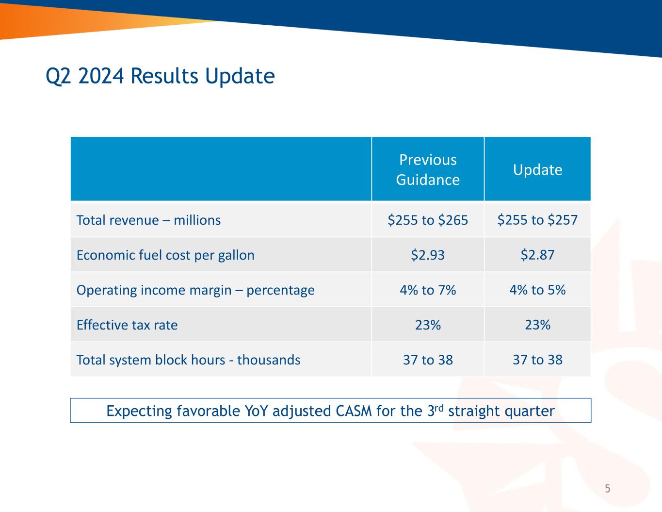 5 Previous Guidance Update Total revenue – millions $255 to $265 $255 to $257 Economic fuel cost per gallon $2.93 $2.87 Operating income margin – percentage 4% to 7% 4% to 5% Effective tax rate 23% 23% Total system block hours - thousands 37 to 38 37 to 38 Q2 2024 Results Update Expecting favorable YoY adjusted CASM for the 3rd straight quarter
