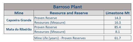 | Capoeira Grande | Barroso, MG | 100 | CSN Cimentos Brasil | 93.4 | Production | Yes | (2) | Open Pit / Limestone | Capoeira Grande Mining Facilities |